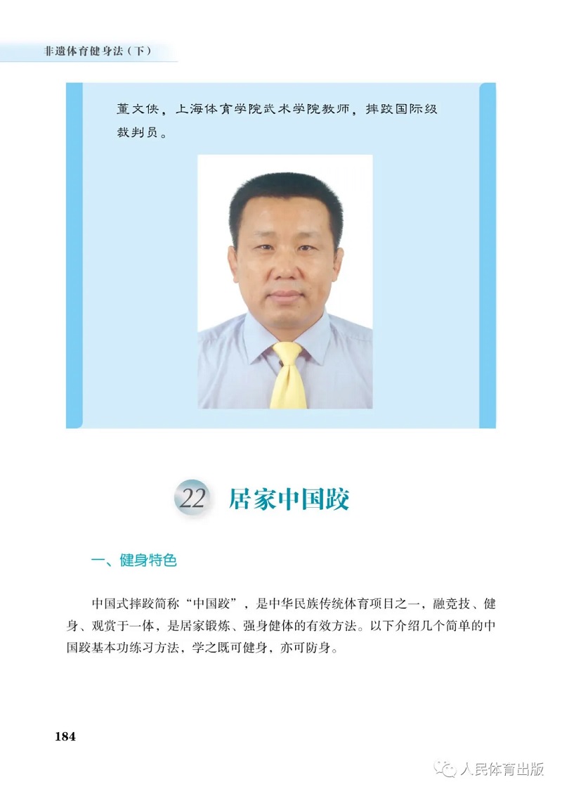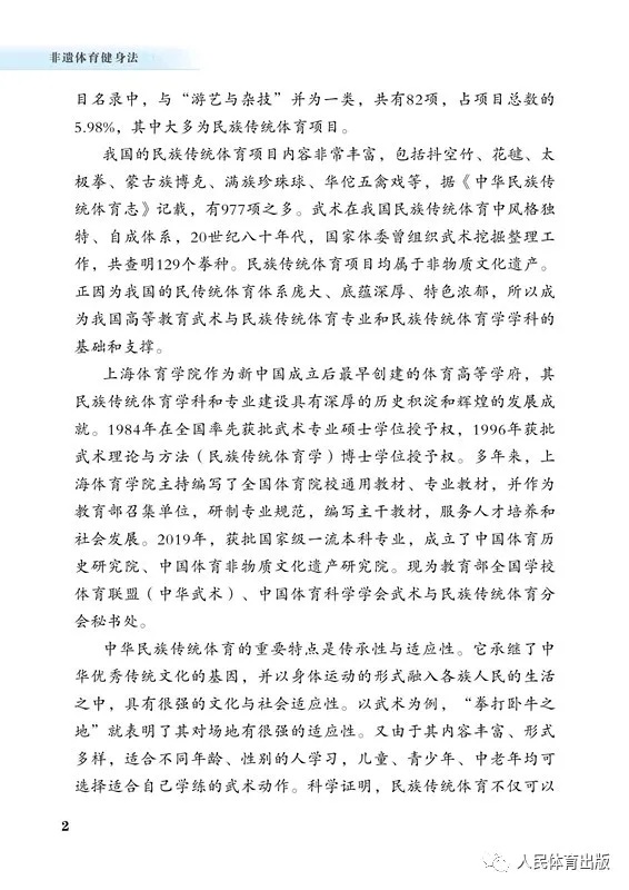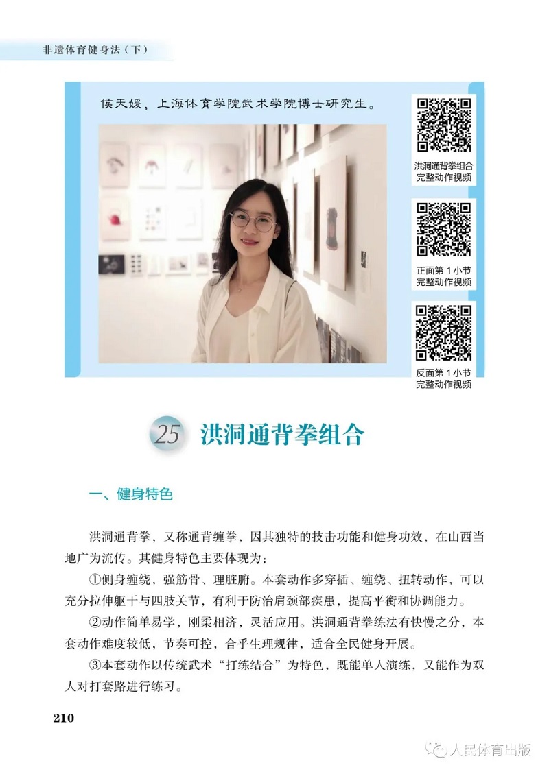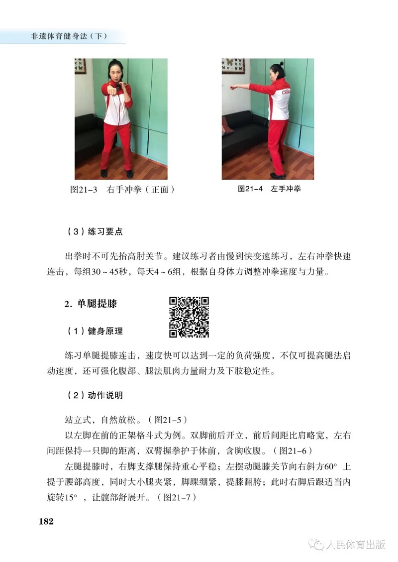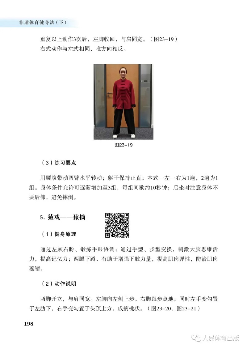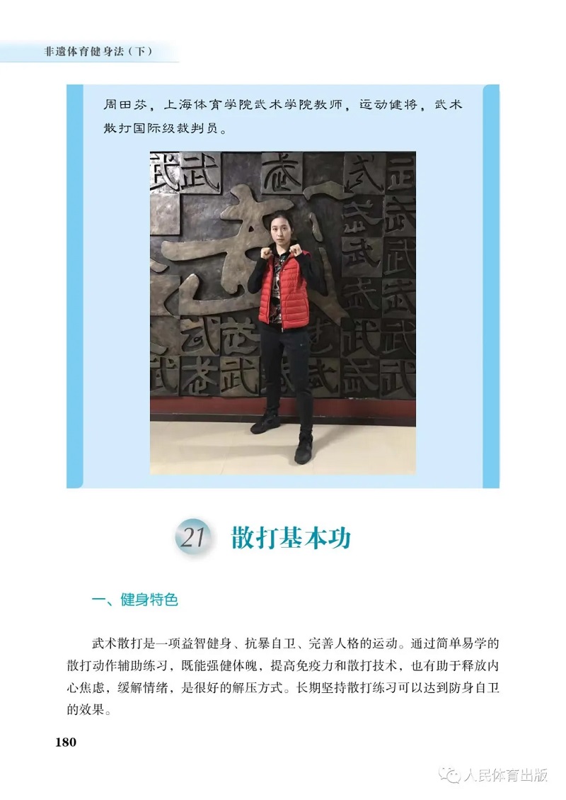 《非遗体育健身法》精选出太极拳、形意拳、八卦掌、通背拳、八极拳、少林拳、鹰爪翻子拳、华佗五禽戏等27个项目,融合体育科学健身原理,“研究、整理、编创”三结合,以文字描述、图片示范、视频演练的形式,提供了丰富多元的武术与民族传统体育健身方法