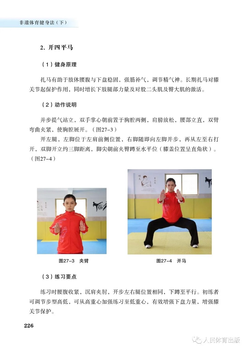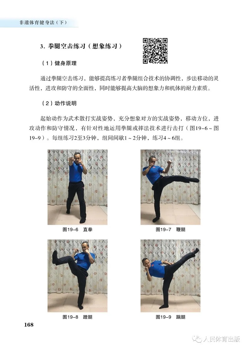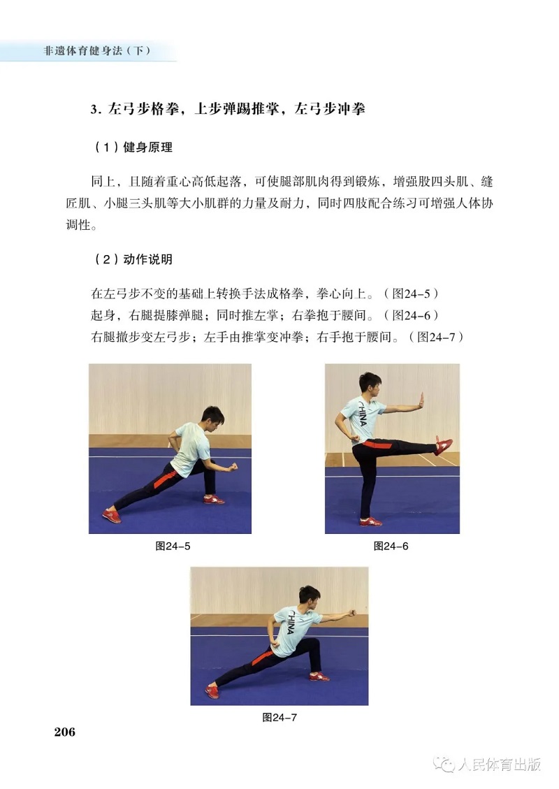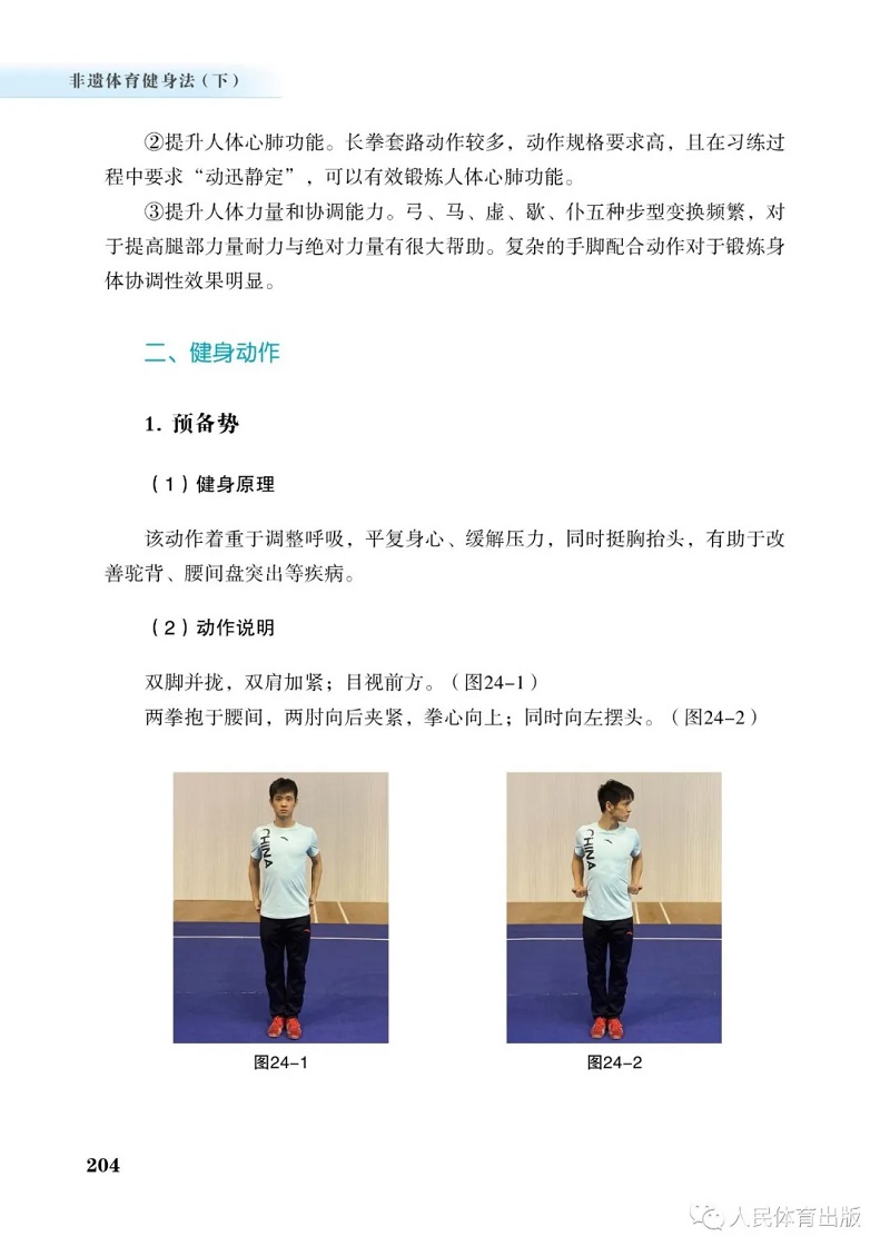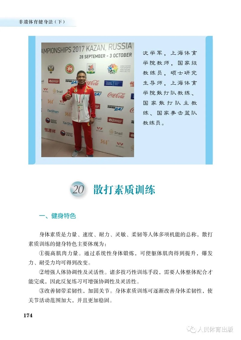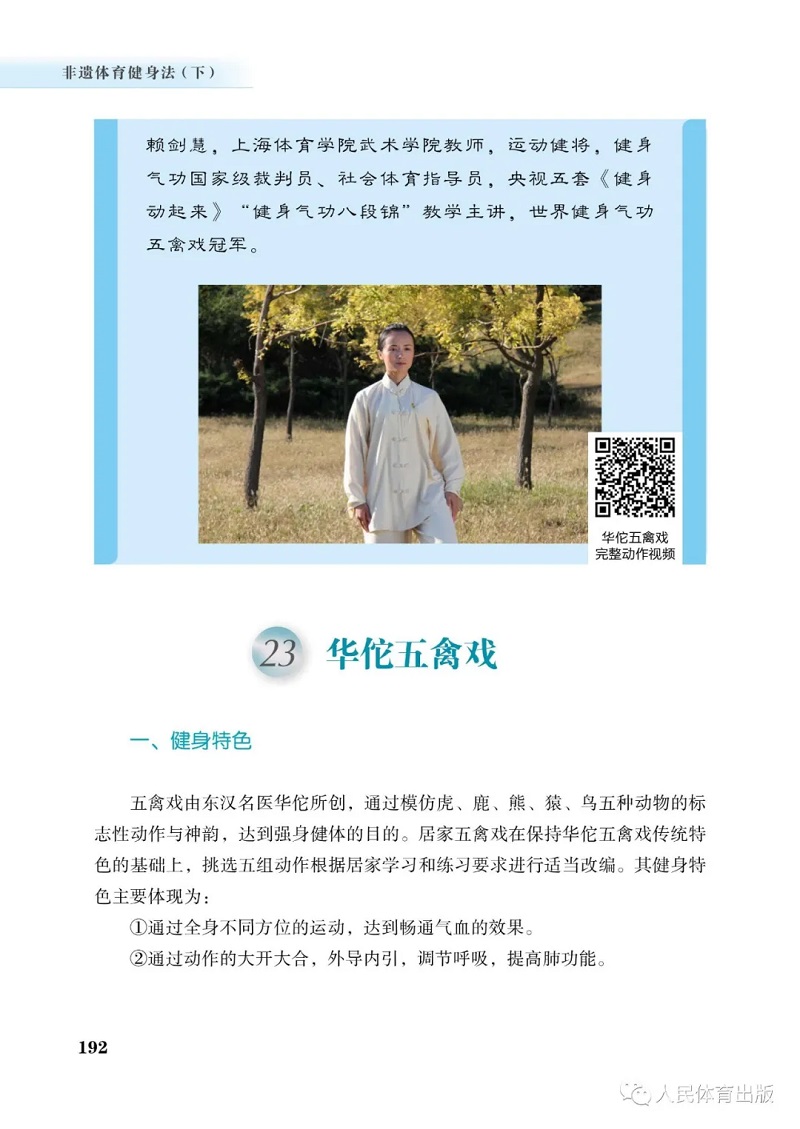 《非遗体育健身法》精选出太极拳、形意拳、八卦掌、通背拳、八极拳、少林拳、鹰爪翻子拳、华佗五禽戏等27个项目,融合体育科学健身原理,“研究、整理、编创”三结合,以文字描述、图片示范、视频演练的形式,提供了丰富多元的武术与民族传统体育健身方法