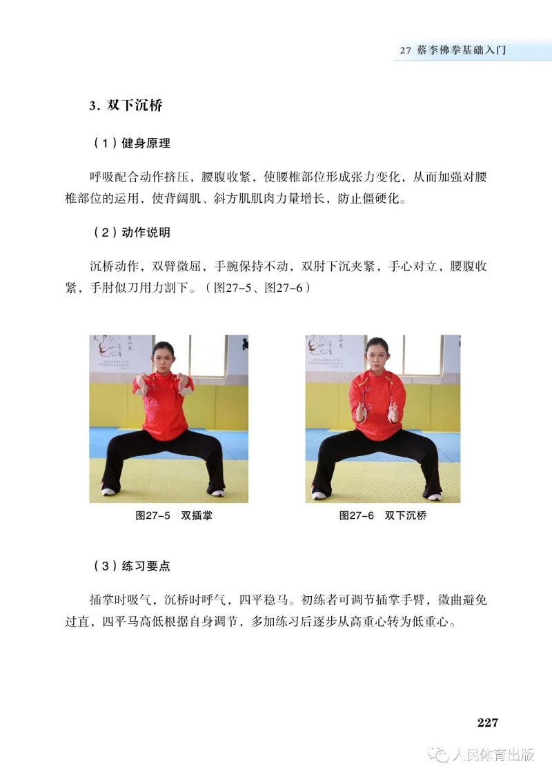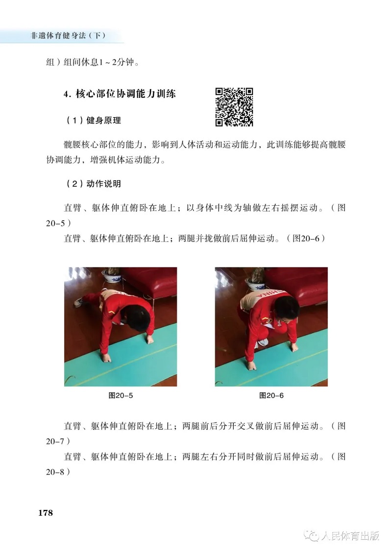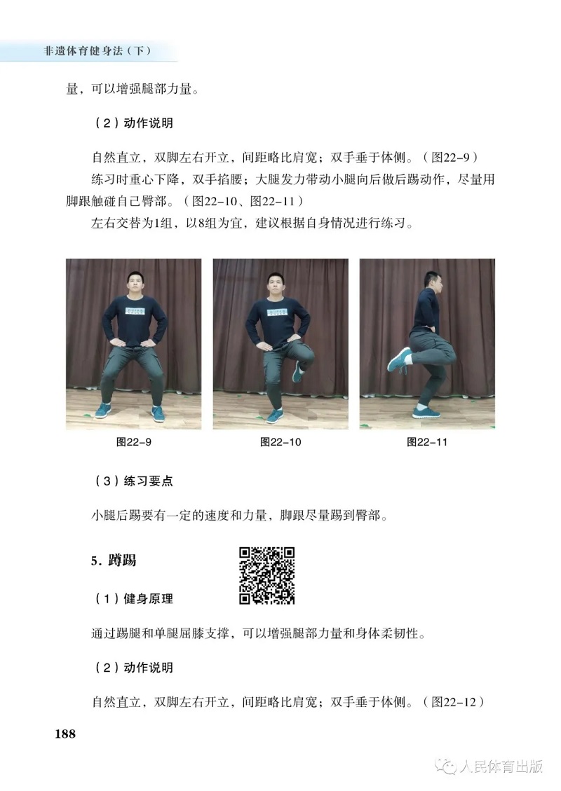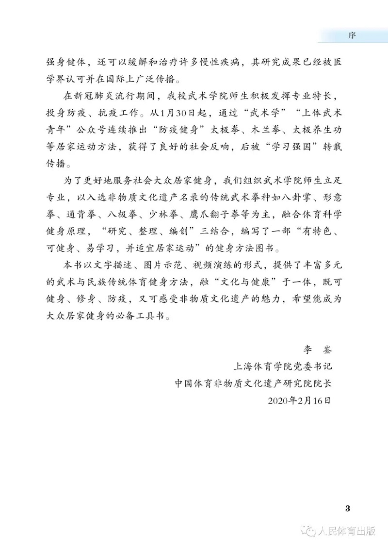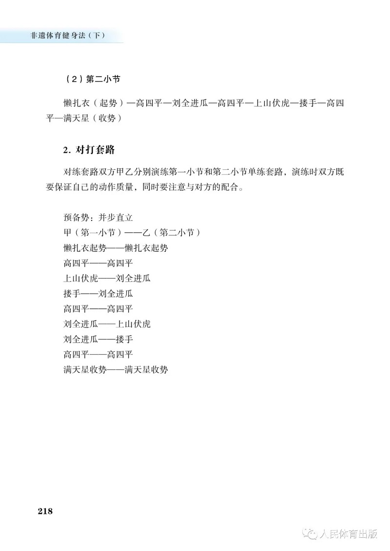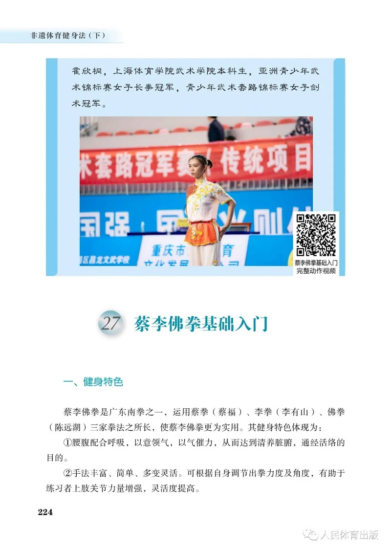 《非遗体育健身法》精选出太极拳、形意拳、八卦掌、通背拳、八极拳、少林拳、鹰爪翻子拳、华佗五禽戏等27个项目,融合体育科学健身原理,“研究、整理、编创”三结合,以文字描述、图片示范、视频演练的形式,提供了丰富多元的武术与民族传统体育健身方法