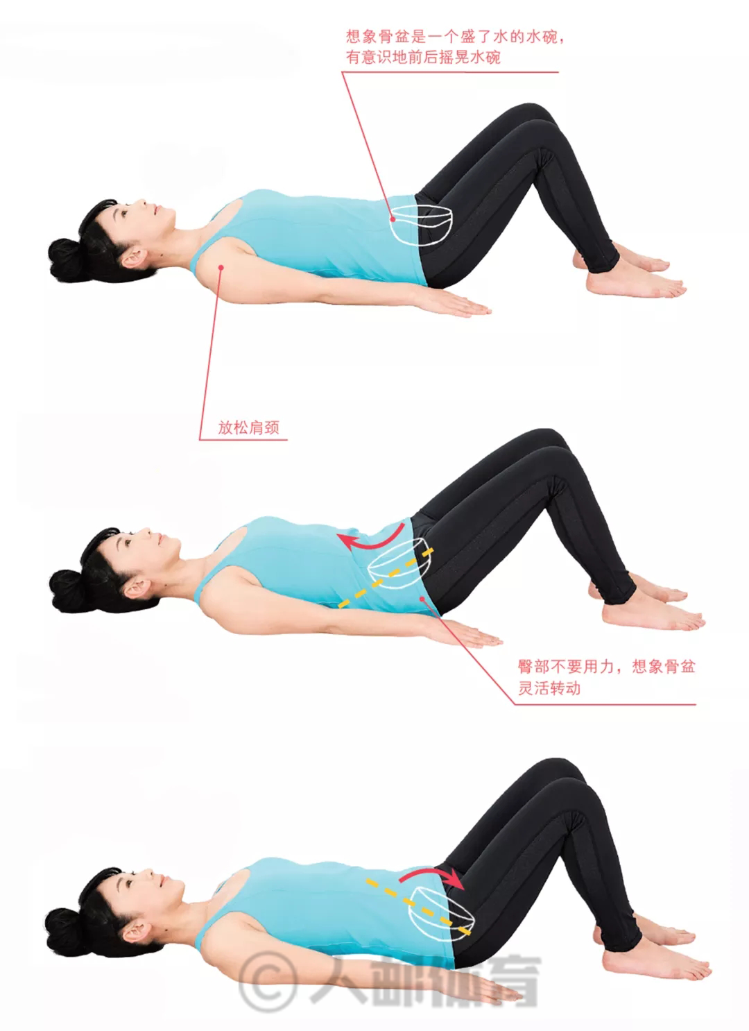 屈膝双脚着地,头部及躯干与地面贴合,想象骨盆是一个盛了水的水碗,慢慢前后晃动水碗,让盆底肌肉向肚脐方向抬起。
