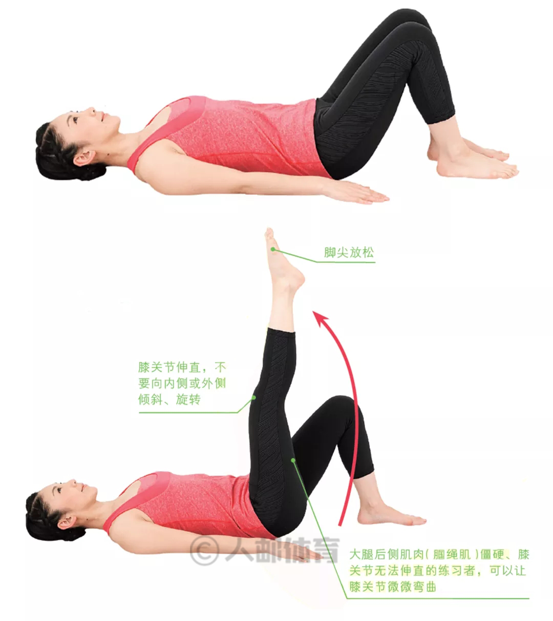 2.呼气,右腿抬起,膝关节伸直,脚尖指向天花板。呼气的同时,右腿抬起,膝关节伸直,脚尖指向天花板。右腿抬高至最高点后,吸气。