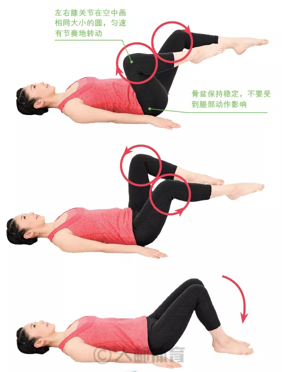 4.呼气,同步骤3类似,膝关节向左转动。腿部保持悬空状态,呼气的同时,膝关节向左逆时针转动画8 字形,转动2 ~ 5 圈后,吸气。