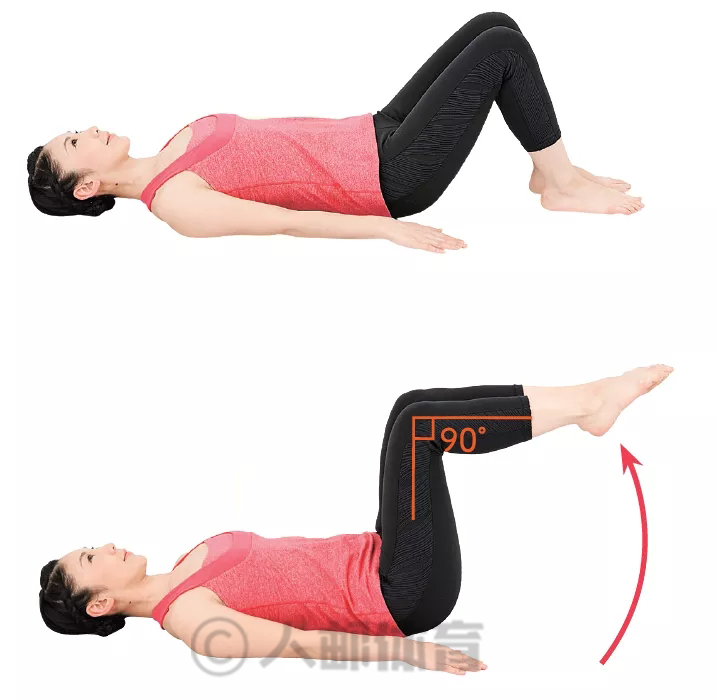 2.呼气,双腿分别抬起。呼气的同时,双腿分别抬起。双腿并拢,膝关节弯曲呈90度角,吸气。