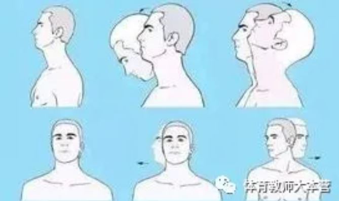 动作要领:水平左右旋转头部,缓慢转到一侧,直到转不动的时候,再轻轻用小力抻一抻。(即多转一、二度)不要刻意使劲去转,然后慢慢回到中间,再做另一侧。同理还有前后方向,倾斜方向。
