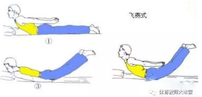 动作要领:俯卧床上,去枕;双手背后,用力挺胸抬头,使头胸离开床面;同时膝关节伸直,两大腿用力向后,也离开床面,持续3~5秒,然后肌肉放松,间隙5s。练习3-5组。