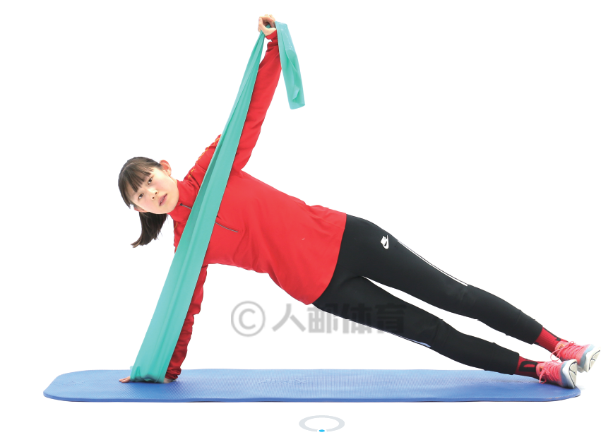 1.身体呈右侧卧姿势,将弹力带一端用右手固定在垫子上,左手握住另一端。右臂伸直撑起身体,左脚叠放于右脚之上。