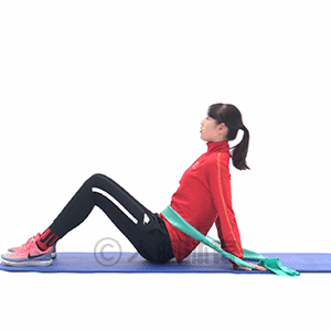 1.坐在垫子上,双脚、双腿分开。用双手将弹力带两端固定在垫子上,中段绕过腹部。
