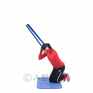 1.双膝跪在垫子上。将弹力带中段固定在身体正前方的高处,双手握住两端。向前俯身,双臂屈肘,双手放在耳旁,保持弹力带有一定张力。
