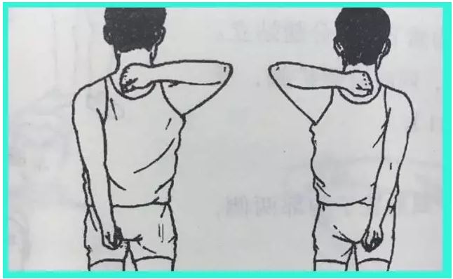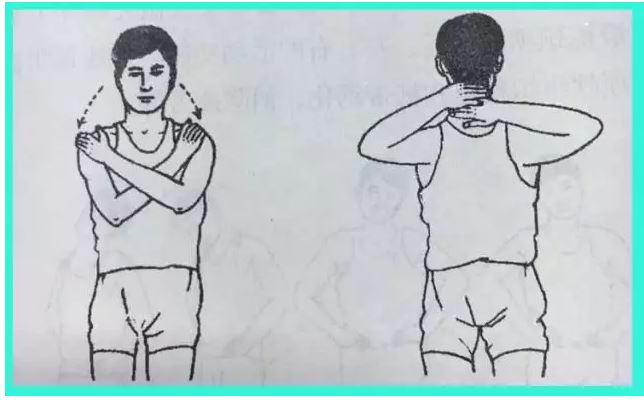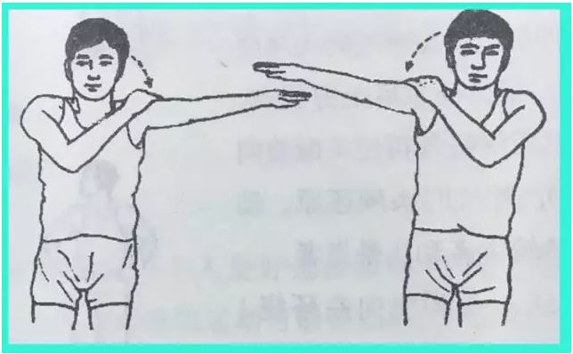 双手开掌自然放下,左手向外举起平肩水平,掌心向下,右手内收旋肩,掌心搭于左肩,头颈随右肩旋转于左边;然后左右手换位。