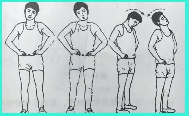 取站位,躯干挺直,双脚自然分开与肩同宽,全身放松,双眼自然开合,头颈中立位,精神集中于动作上。双手叉腰,头颈左侧屈、右侧屈、后仰。