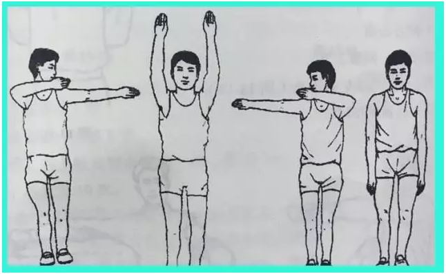 如此交替进行做完4个8拍后,收回预备动作。可有效缓解疲劳,理顺关节、韧带,吸纳天地之灵气,疏通体内之经络,以达到强壮身体的目的。预防颈肩臂痛有很好的作用。