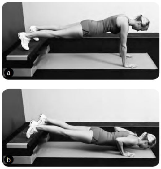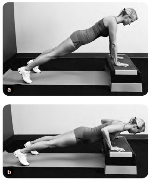 双手放在台阶上(如果有类似高度或更高的椅子,也可以使用),双手间距略大于肩宽,腿向后伸展,使身体成一个平板,从头部到脚呈一条直线。屈曲肘关节来降低身体,直到身体跟阶梯间有大约一个拳头的距离。