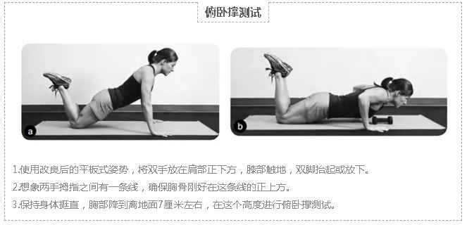俯卧撑测试常被用于评估肱三头肌、前三角肌和胸肌的力量。女性一般使用改良过的屈膝姿势,即跪姿俯卧撑:双手和双膝撑地,其余动作同标准俯卧撑。