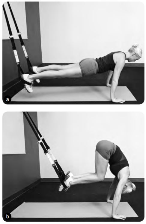 跪在地面上,脚放在脚架上,脚尖朝向远离TRX锚点的方向。拉伸皮带(脚架距离地面约8英寸),使身体位于锚点下方并与锚点对齐。从双手开始,使身体呈平板状。向上抬起尾骨,并将膝部拉到胸前,使脊柱呈弧形。要想使这项运动更有挑战性, 可以向前移动,或者说离锚点更远。