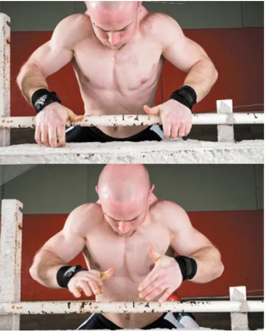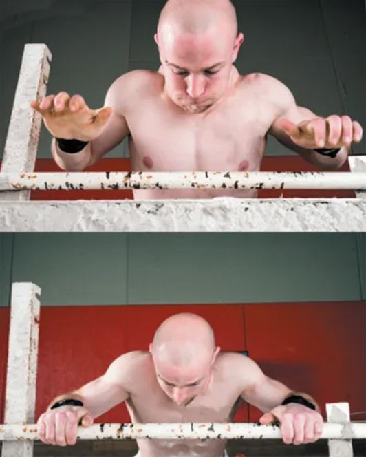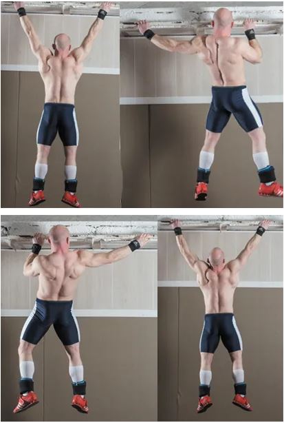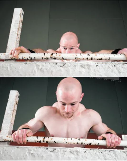 1.抓住单杠,收紧肩胛骨,避免过度的腰部弯曲曲线,然后拉直身体。
