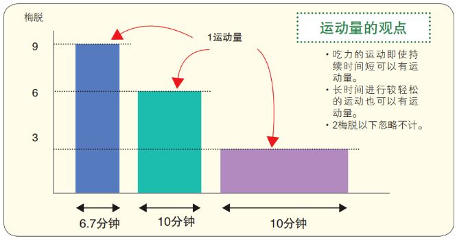 运动量不仅指体育运动,也包括散步和园艺等日常生活活动,是与生活方式相结合的。活动强度的衡量单位为“梅脱”,指运动时的代谢相当于安静时代谢的多少倍。