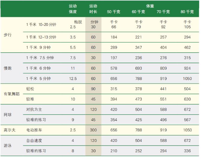 大多数研究表明,大部分生活活动和体育运动中单位时间内消耗的热量可以计算出来。一般使用“梅脱”(MET)这一单位表示热量消耗相当于安静时的代谢量的多少倍。一般认为减重时,每天有300 千卡左右的热量差不会形成太大的负担。因此,可以有以下几种选择。