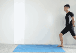 立位,大腿绑上沙袋。一脚向前一大步,脚尖微内扣,屈膝半蹲,大腿略高于水平,膝不过脚尖;另一腿挺膝伸直,脚尖内扣斜前方。双脚全脚着地,上体正对前方,两手腰间抱拳,目视前方,保持此姿势向前行走。每天3次,每次5-10分钟。