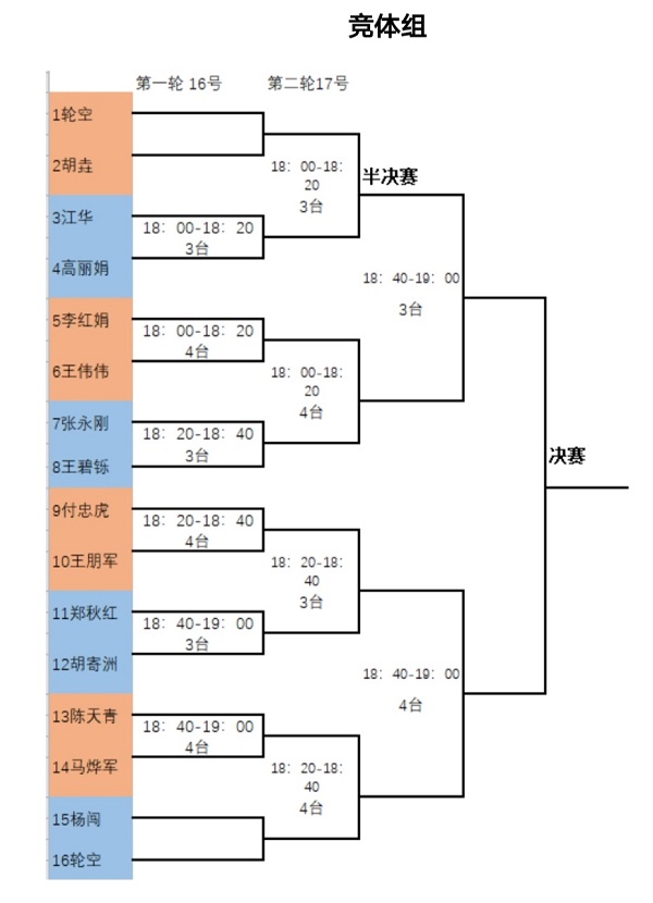 比赛分为教工男子组、教工女子组和竞体组三个组别,预赛采取11分制的三局两胜淘汰赛。全校教职工踊跃报名,几十位老师代表各部门院系的顶级实力齐聚一堂“华山论剑”。竞技体育中心一共有14位老师参加了比赛,经抽签分组得到了如下的对阵表。