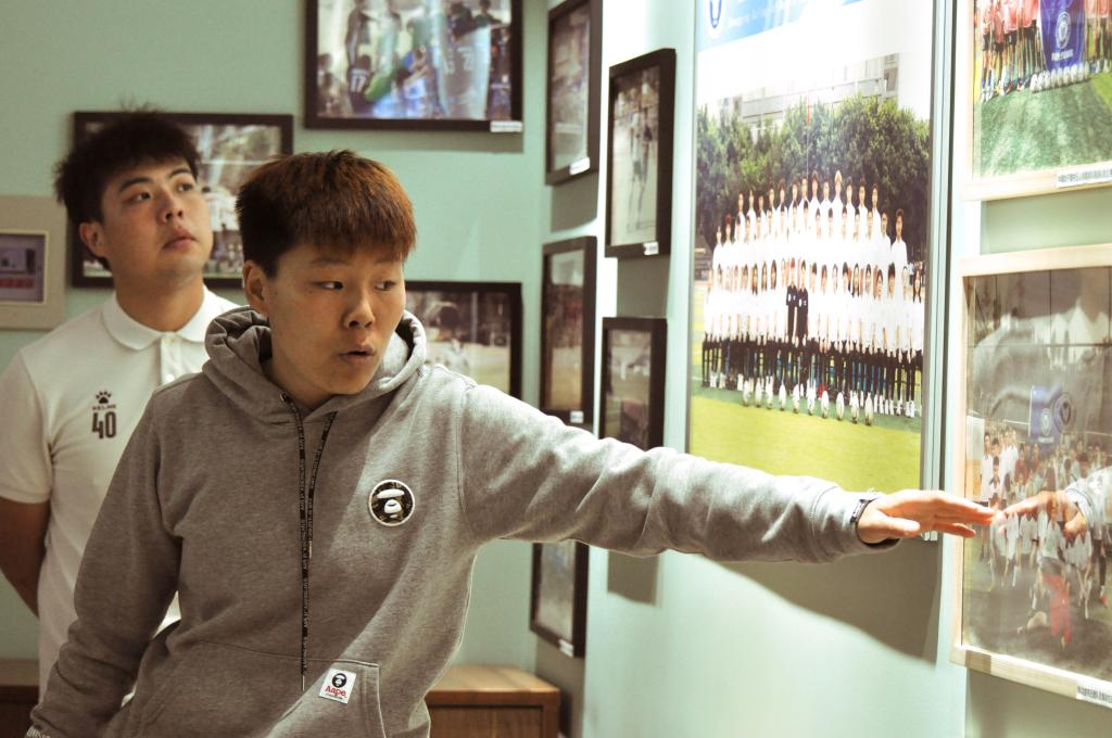 本次揭牌仪式后,各位老师和同学们在曹玉姣老师和江晓羽老师的带领下一同参观了足球基地。签满校足球队所有队员名字的队服以及饱含荣誉的两面队旗首先印入大家的眼帘。随着江晓羽老师的讲解,照片墙上队员们英姿勃发的身影,也勾起在场师生们的浓浓回忆,训练的汗水、胜利的喜悦都历历在目。最吸人眼球的就是那块特大号战术板,化身为“球衣”的队员们在战术板上的一次次排兵布阵都验证着理论联系实际的重要性。而荣誉墙则见证着,每一位队员为移通足球队拼搏、付出的足迹。足球基地里陈列的点点滴滴不仅让来到这里的每一位参观者感受到校足球队的专业水平,也感受到校足球队团结、拼搏与温情的体育精神。