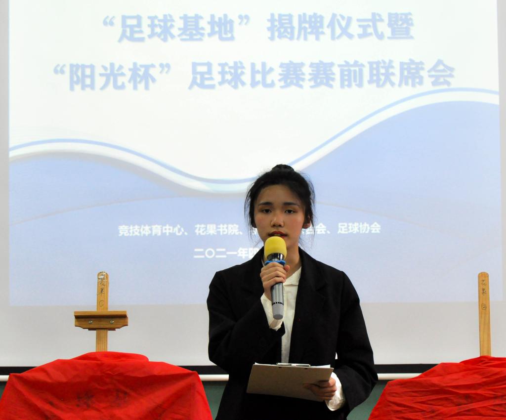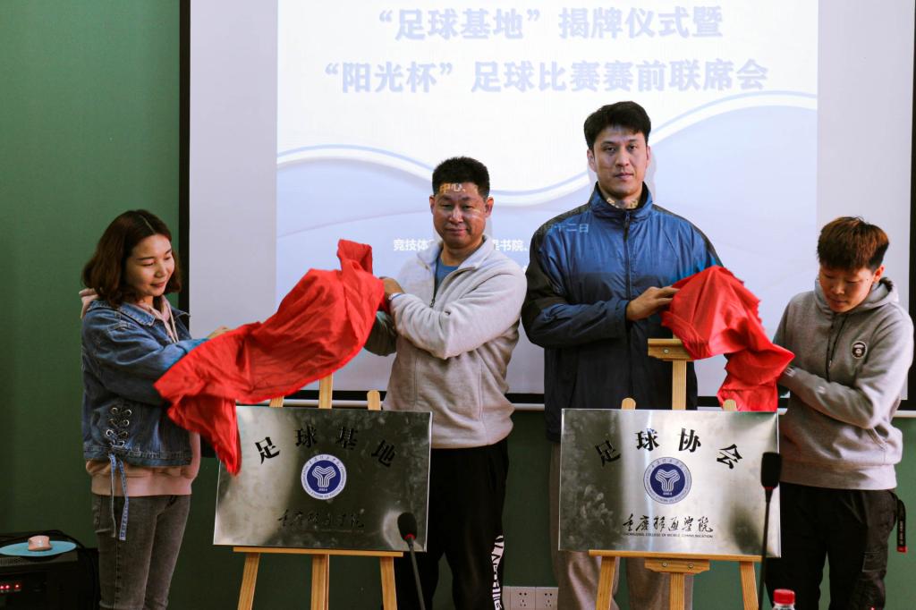 本次揭牌仪式邀请到了体育教学部教研室主任刘玉林老师、体育训练部主任孙哲老师、校男子足球队教练江晓羽老师、花果书院综合办公室主任曹玉姣老师以及各二级院系竞技体育板块负责老师。在主持人简要介绍足球基地的概况与发展规划后,由刘玉林老师、孙哲老师、江晓羽老师以及曹玉姣老师共同进行了揭牌。随着红幕落下,标志着竞技体育中心与花果书院的联动融合更进一步,为推进我校“四体育人”体育育人理念的落地与构建全校体育育人大格局建设贡献力量。