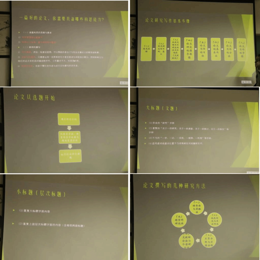 接着,梁教授为大家介绍了学术论文标题拟定的原则。就标题切合实际,删繁就简,便于检索等7个方面作了介绍,强调标题要“接地气”不能一味“高大上”以及精炼的原则。并要求大家通过标题与提纲的拟定,区分写作目的与写作内容的不同。然后,梁教授对论文撰写的几种研究方法进行了深入的引导。其中,对使用最广泛的“文献法”的运用要点作了详细的阐述,对数理统计数据量表的运用作了深入的讲解,对于跨学科的研究方法作了引导与介绍,并鼓励大家积极赶上当今大数据物联网等新兴信息科学的发展,在扎实传统研究方法的同时,多接触新科学新事物,让其与体育相结合探索出新的方向。最后,梁教授通过一篇论文带大家回顾了本次讲座的各项要点,希望大家能够通过本次讲座有所收获,一方面希望教师们可以在职称评定,科研成就等方面有所提升,另一方面更希望教师们能够突破自我为学校甚至重庆市乃至国家的体育教育事业添砖加瓦。