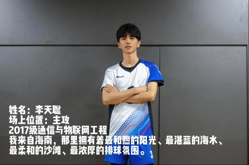 校男子排球队李天聪,2017级通信与信息工程学院学生,场上主攻。2017年,加入排球队,因为喜爱排球才加入到这个大集体当中,打排球让他深刻体会到团体竞技体育的魅力。正是对着排球的热情,想要将这个爱好尽所能的做到最好,打好每一颗球不留遗憾。从大一开始和队友们每天一起训练,一起训练体能、移动、接球、发球、打防、扣球,每一天的训练都是汗流浃背,但大家都不曾放弃,始终坚持。排球是集体运动类型的项目,队友之间需要不断的磨合沟通,才能配合战术。在集体久了,让他明白了热爱就要坚持,要团结配合,相信队友,并肩作战,才能成功。