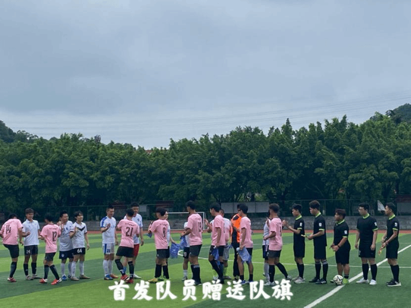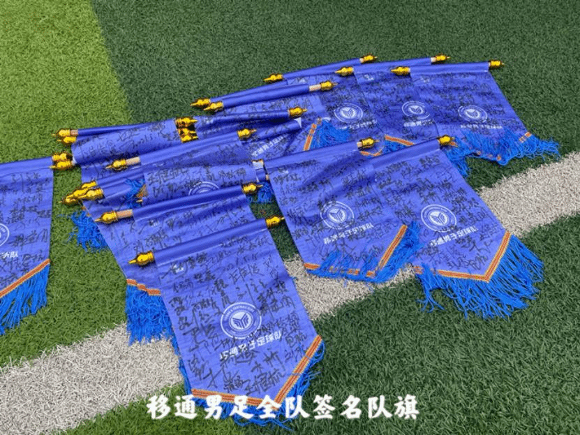 在参观完足球基地后,校友们与移通男足进行了足球交流赛。在比赛开始前的列队中,十一副带着全队签名的队旗从队员们的手里转交到了前辈们的手里。