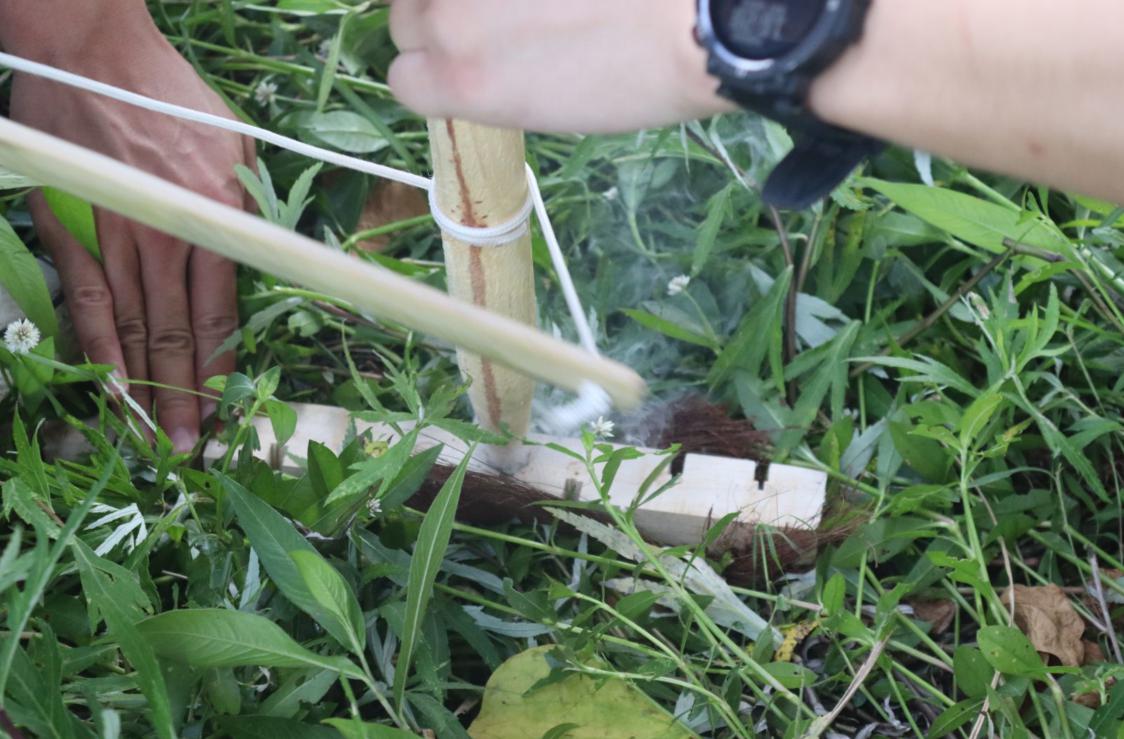 到达驻扎地,段教练拿出提前准备好的道具,进行户外必学一项技能,如何在野外生火,着重讲解了钻木取火,同学们跃跃欲试,忙的不亦乐乎,手都搓冒烟了,但收效甚微,大家没有放弃,继续努力,终于生出火来,看着小火苗慢慢燃起来,感受着户外的魅力。这时大家一队搭建帐篷,另一队开始洗菜做饭。耳边吹来的风显得格外凉爽。不时停下来休息,抬头一看发现已有几颗星星在天边闪烁,夜幕笼罩大地,星星在不知不觉中已经明灭在整个天空。到了休息的时间,帐篷亮起了灯,笑语渐渐化为梦呓。