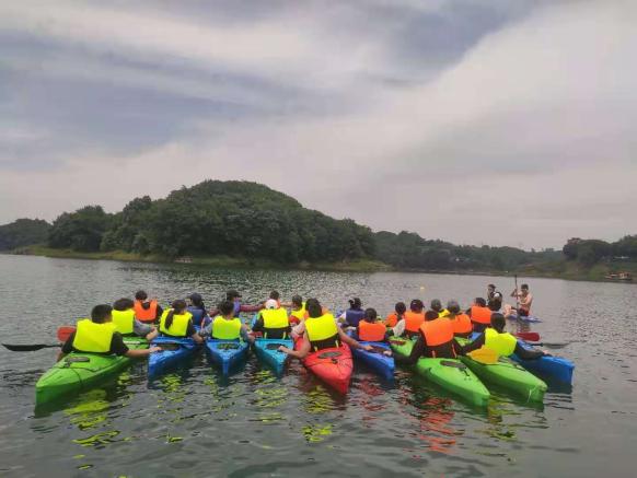 吃过午饭后,教练们带着学员们进行了一项激动人心的项目——体验皮划艇。所有人都上了皮划艇后,教练让学员们把船划到一起,依次摆开,每艘船的船头都对整齐,进行有趣的跑艇活动,顾名思义就是从一个皮划艇跑到另一个皮划艇上,因为穿戴了救生衣所以学员还可以尝试跑完艇后再跳进水里,体验过程非常的安全刺激有趣,湖面上飘荡着学员们的欢笑声。欢乐的时光很快就过去,学员们一起启程返校校了。