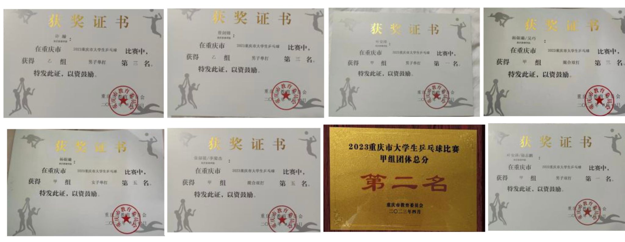 4月24日,重庆市大学生乒乓球比赛在重庆邮电大学隆重举行,本次比赛共有46所院校,660名运动员参赛,创历届之最。移通乒乓球队在甘素和吴秀云两位教练的带领下,克服困难发扬了奋勇拼搏、坚韧不拔、团结一心的体育精神,最终获得:甲组,男子团体第一、男单第一、男双第一、混双第三、混双第五、女单第五、甲组团体总分第二;乙组:男单2个并列第三的优异成绩。