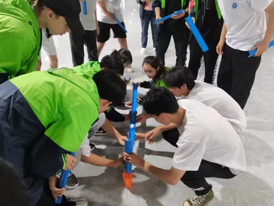 第一个团队项目——珠行万里。各队通过使用手中的PC管,运送小球至前方的塑料杯中,期间手不能触碰到小球,运送小球的过程中不能使小球回溯或停顿,小球浸入杯中,杯子不能倒地。在东溪食堂三楼上可以看到六个小队练习的身影,一次又一次的尝试,一遍又一遍的重复,他们毫不懈怠,力求把每颗球都运送到杯中。项目的最后,教练带领同学去总结和反省,让同学们从此次项目中学习到队伍之间需要互相倾听,互相沟通,才能让自己的团队更有凝聚力,更加强大。