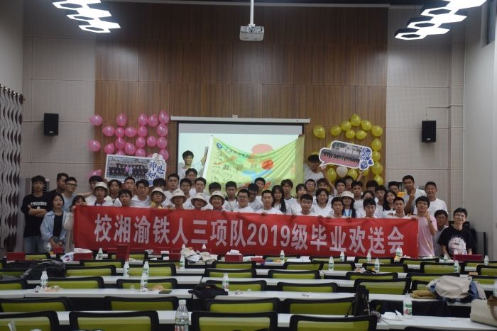 校13铁人三项队2019级毕业欢送会于6月13日在创梦空间举行。大四学长身着正装陆续进场,新老队员高声欢呼,整个会场气氛高涨。到了大四队员的退队仪式,开始播放一段回忆视频,一幕幕经历、一张张照片不断闪过,红了眼眶、湿了衣襟,每个队员的情绪都被调动起来。大屏幕上,每个大四队员的简介依次浮现,队旗上印刻着他们的名字。李游教练为他们送出毕业大礼包,里面是整个队伍对他们的祝福与希望。衷心的祝愿,愿他们历尽千帆,归来仍是少年!