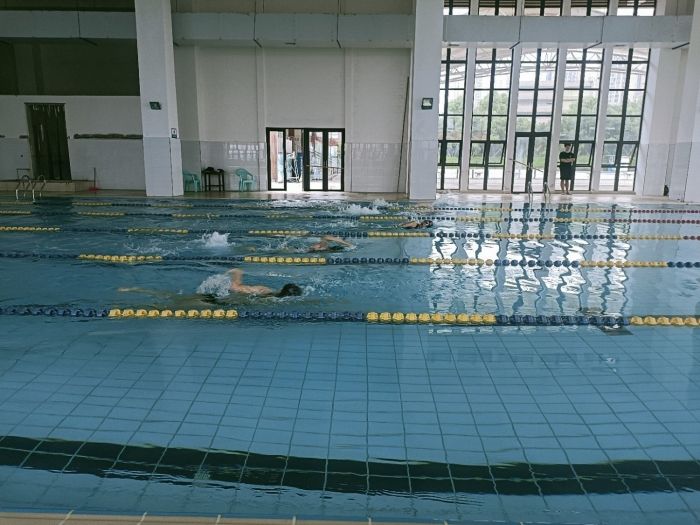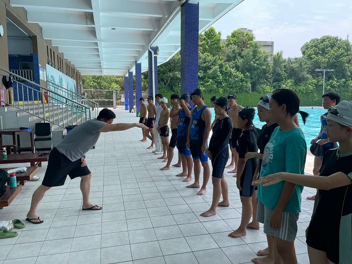2023年6月2日,在C区游泳池,黄静教练指导校湘渝铁人三项队队员进行游泳训练,此训练以自由泳训练为主,有氧跑步训练为辅,旨在提高队员们的自由泳水平,增强游泳耐力。