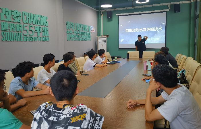 校13铁人三项队于6月6日在花果书院201大型会议室进行“自由泳划水及呼吸技术”为主题的理论学习。李游教练针对队员动作姿势上的误区提出了针对性的意见,强调了划手推水的要点及重要性,并对此做出正确的示范。