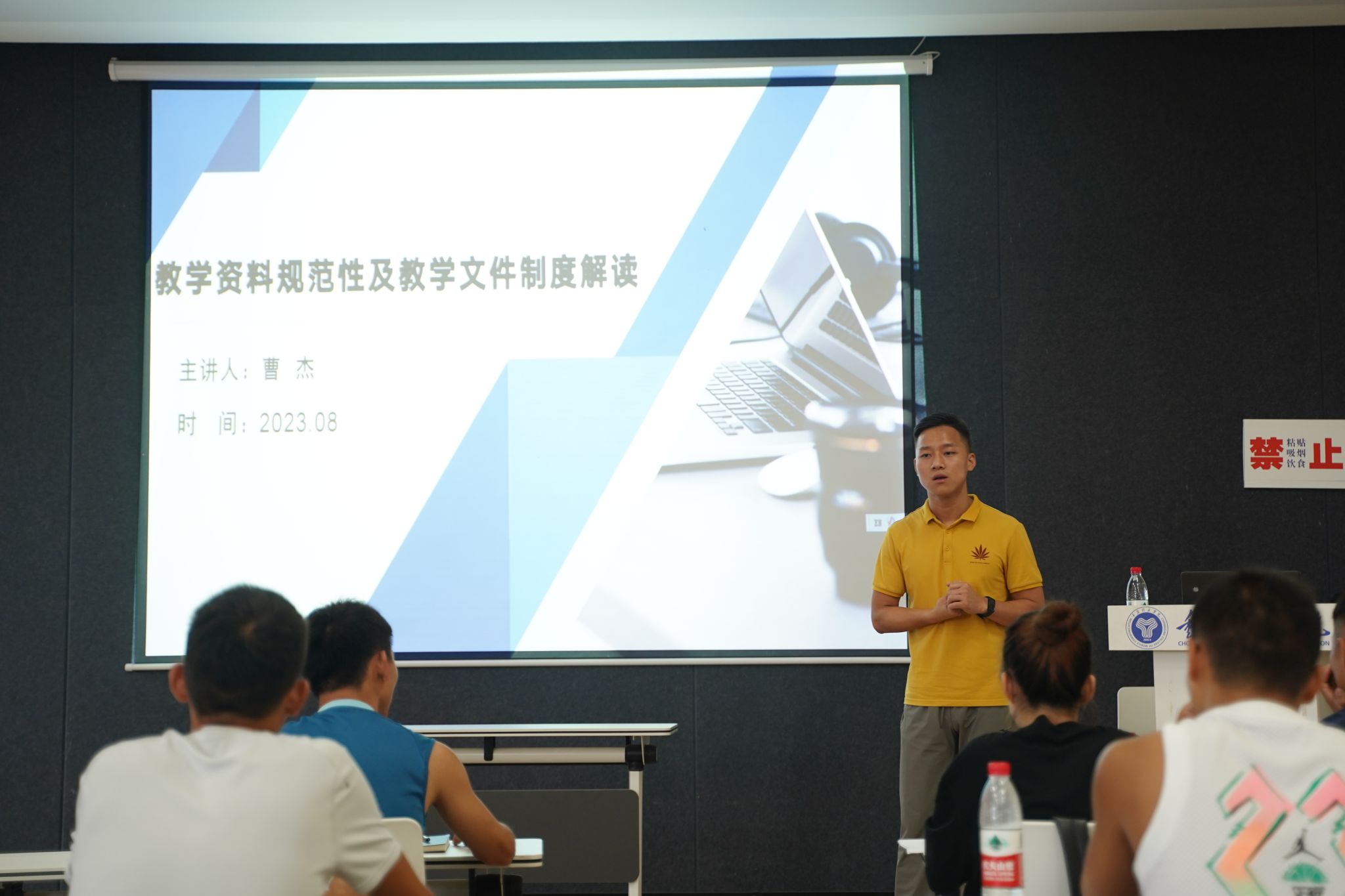教学部曹杰老师进行了《教学资料规范解读及教学事故认定》《大学生体质健康测试标准及测试规范》《体育教学部教研室发展规范》三个专题解读,针对教师教学工作内容进行了细化讲解。提醒新教师教学资料准备要充分,教学过程要严谨,保证安全的前提下,大胆尝试新的教学方法,提高教学质量。针对体育教学部教研室的发展,强调体育教学部教研室的发展离不开每一位老师的努力,同时体育教学部教研室也是成就老师的平台。