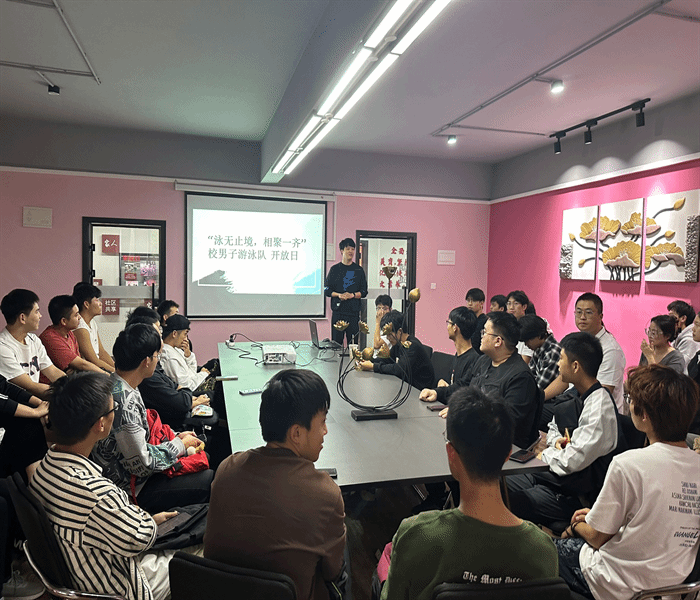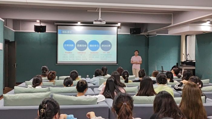 10月11日,校女子游泳队以“走进㵘淼、巡游湛蓝时光”为主题,于爱莲书院多功能影音室举办了校队开放日活动。本次活动内容主要分为校队文化、交流互动、参观训练场地和下水体验四个部分。活动伊始,由王钰涵教练为大家介绍校队文化基本情况,同时播放游泳比赛视频,让学生能够更直观的了解游泳运动,随后带领学生们参观游泳场馆并观摩校队训练,而后组织有游泳装备的同学进行水下体验,并由校队成员进行分组教学,感受水下世界与游泳运动的魅力。