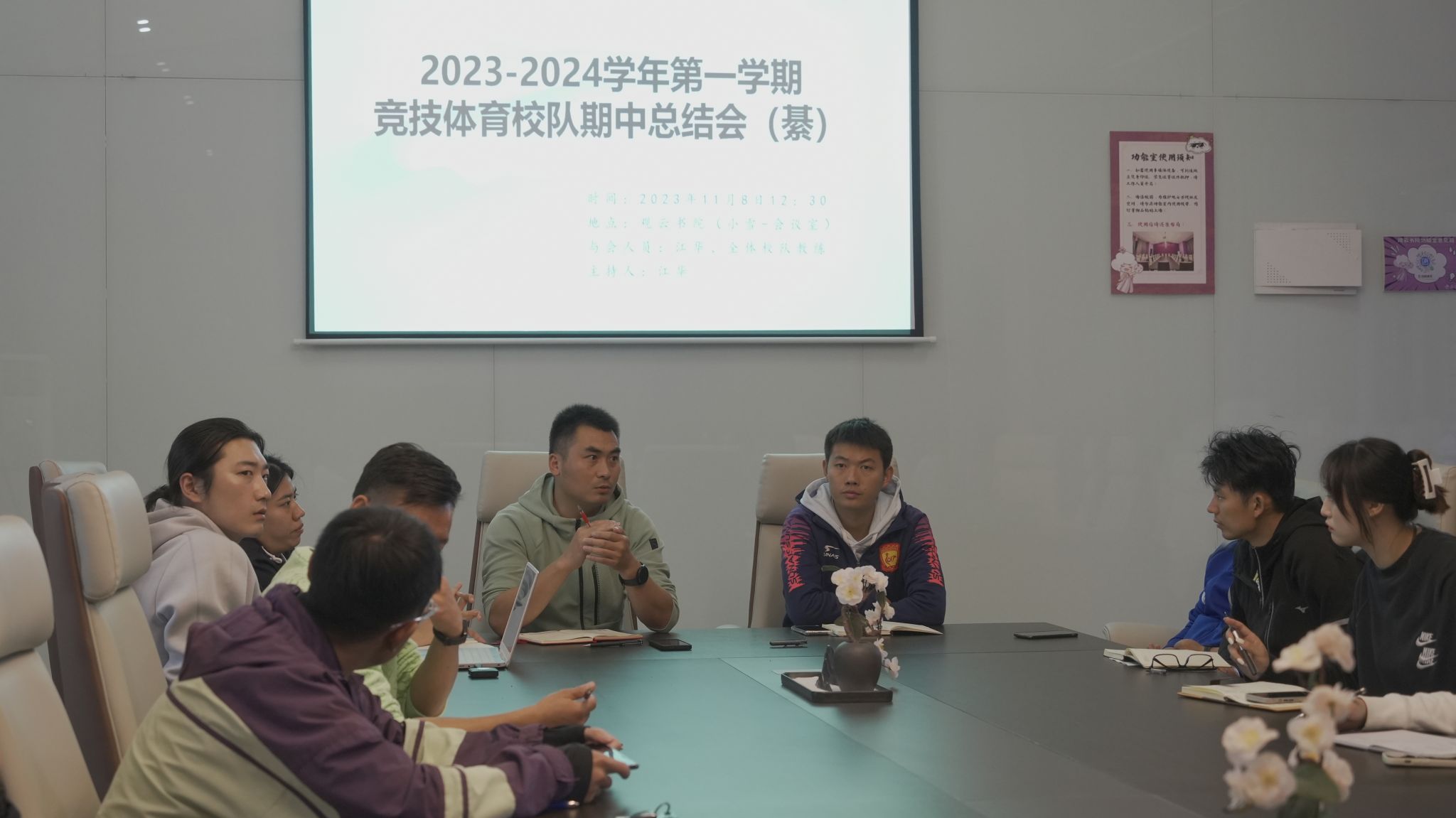 2023年11月8日,2023-2024学年第一学期竞技体育校队期中总结会在江华主任的主持下于观云书院小雪会议室如期举行。本次会议对各校队前半学期的教学训练成果和相关工作问题进行了回顾总结,并由此展望未来的规划。