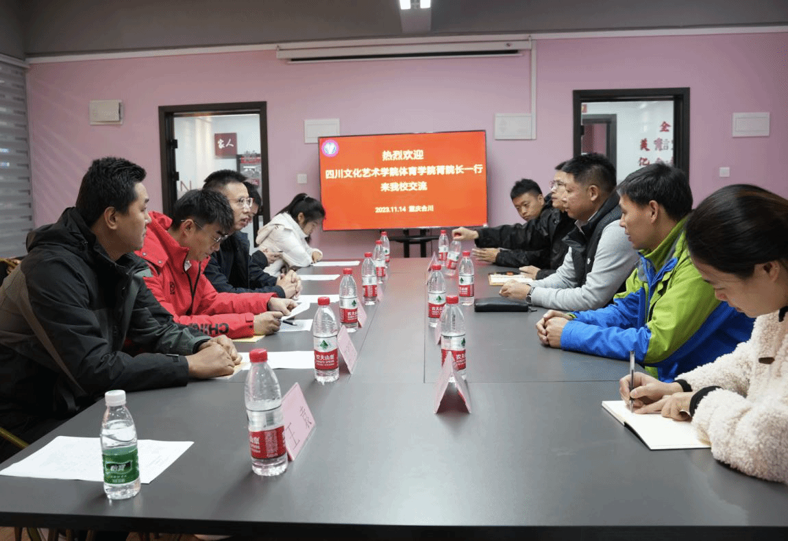 交流活动由我校竞技体育中心主任刘玉林主持,首先刘主任向胥院长一行表示热烈欢迎,并介绍了重庆移通学院的发展历程、办学特色及竞技体育中心的基本情况:2015年9月,学校将原体育教学部、拓展训练中心、中国功夫中心和竞技体育中心合并成立竞技体育中心,下设体育教学部、体育训练部、拓展训练部、中国功夫中心、体育活动部五个部,将全校体育教学工作融合到一起,强调将“课程+训练+实践”相结合,积极推进体育教育改革,致力打造“全国非体育院校最体育的大学”。随后胥烈勋院长介绍了四川文化艺术学院体育学院的基本情况,在谈到重庆移通学院和四川文化艺术学院都是特色鲜明的民办本科院校时,胥院长希望通过本次交流,搭建起合作沟通平台,在互学互鉴中推动两校体育工作的高质量发展。四川文化艺术学院体育学院副院长黄韬从师资队伍培养、一流课程建设、承办赛事等方面介绍了他们学院近年来取得的重要成果。