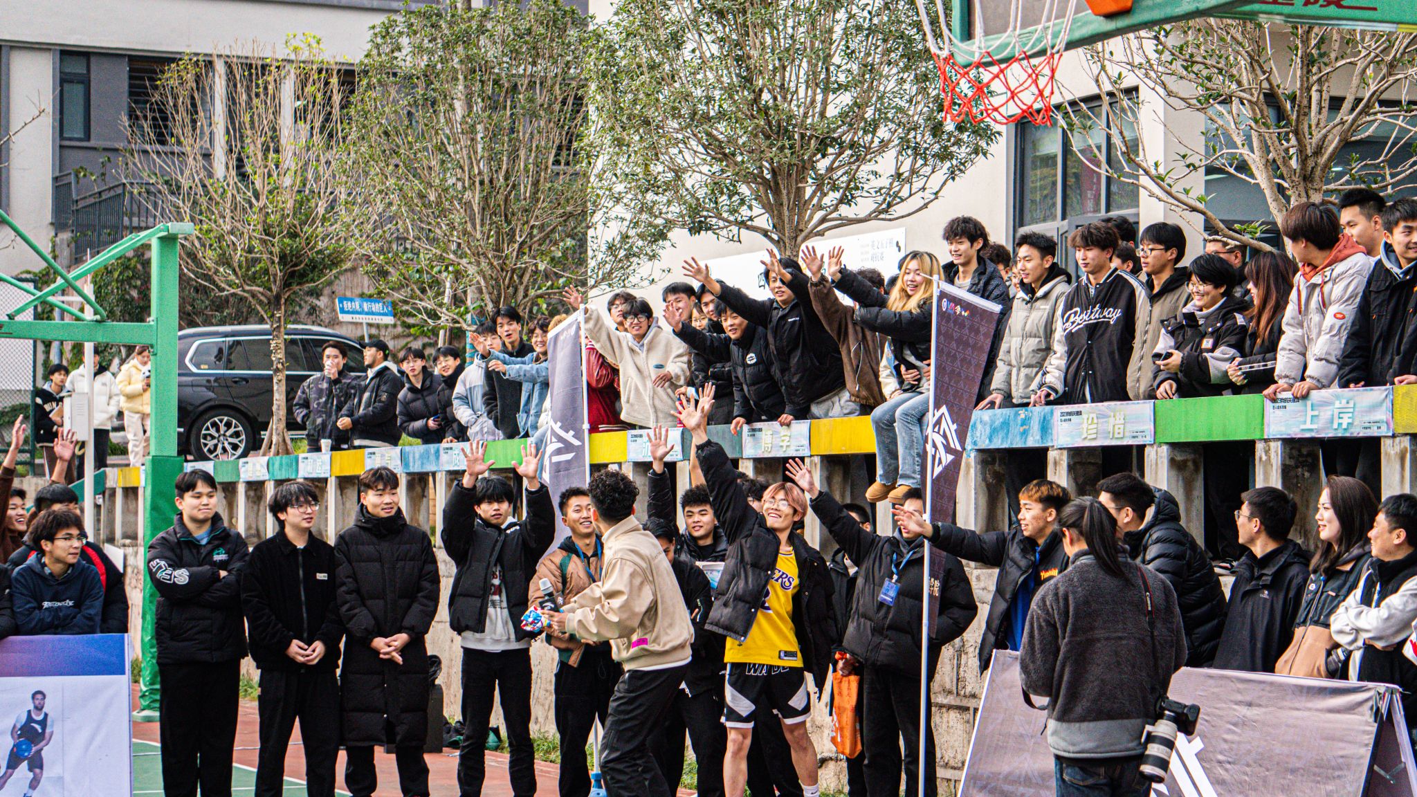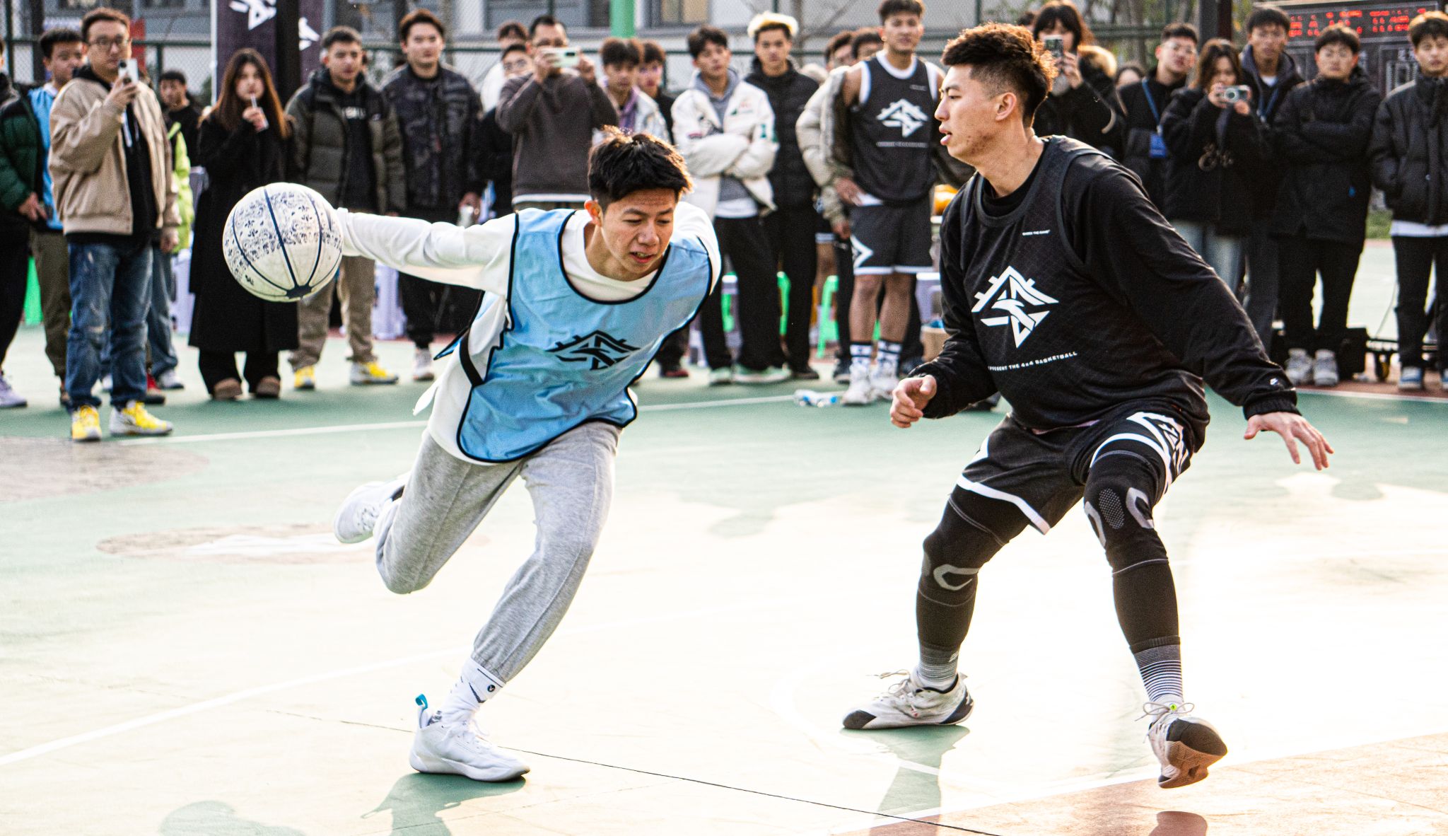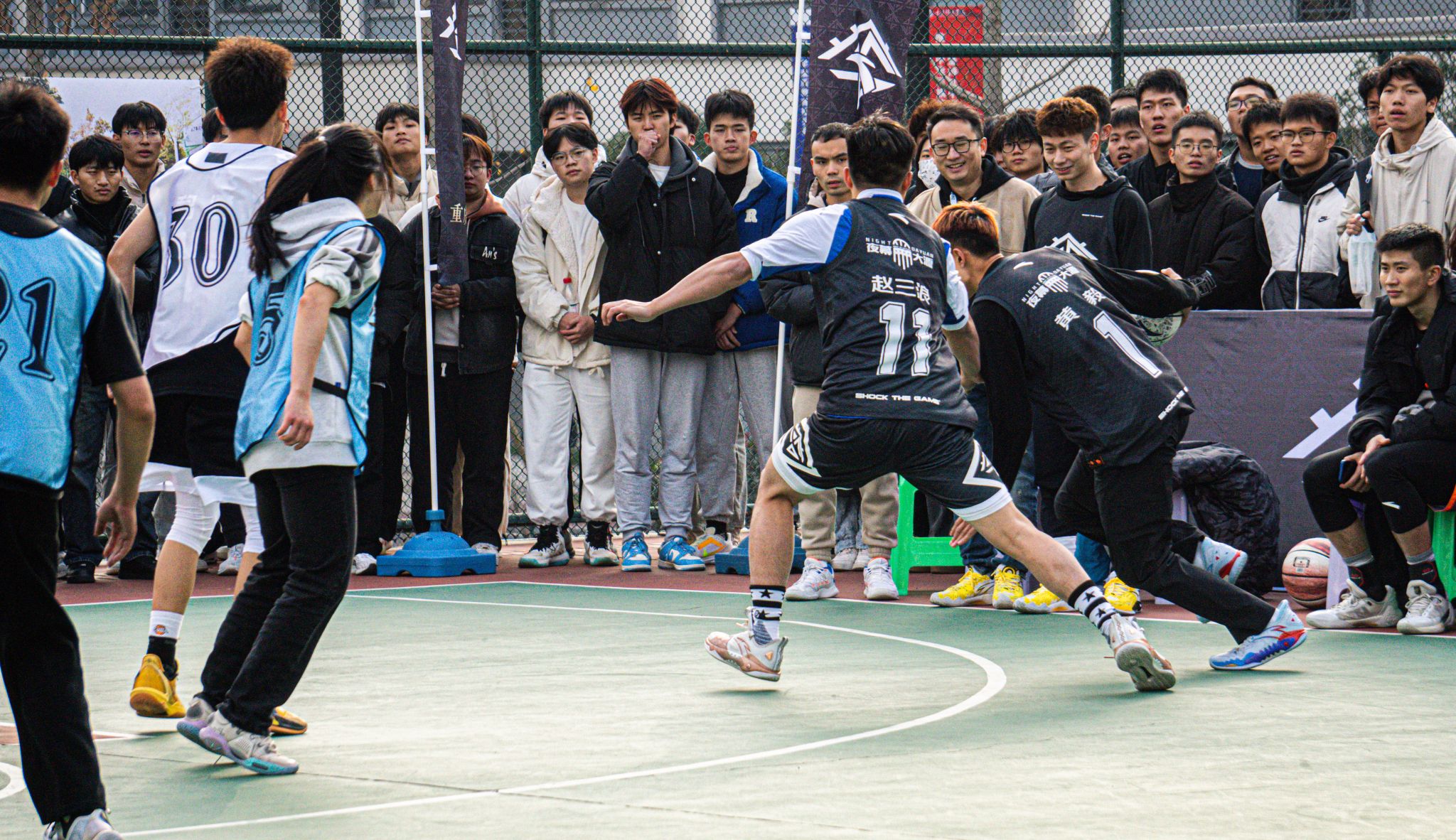 活动现场,安踏篮球明星球员携手校园篮球爱好者,为我们带来了一场独属于篮球的视觉盛宴。一个篮球、一身球衣,一往无前、热血澎湃、激情无限。信念、耐力、配合与激励在篮球场中点点凝聚。力量、拼搏、奋斗与热血在篮筐和计分器上展现。场上双方攻防不断,场外掌声、喝彩声连连。在比赛中,每一个进球、每一场比拼、每一幕画面都令人振奋!安踏篮球明星球员以身作则,为学生们展示了篮球运动的魅力和拼搏精神。在互动环节,学生们纷纷走上球场,与安踏篮球明星球员们同场竞技,感受专业篮球的氛围。