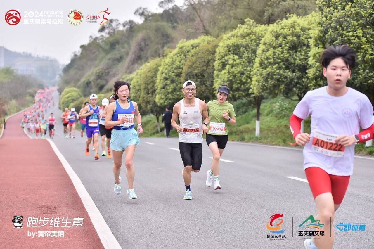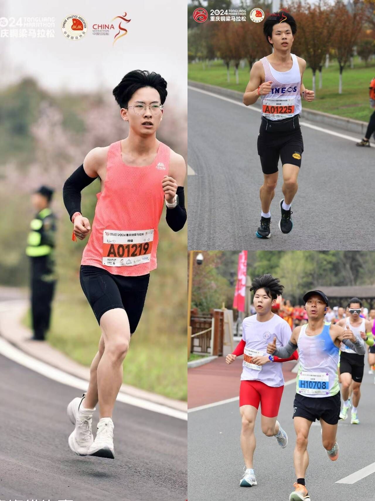 重庆移通学院(綦江)铁人三项训练队9名队员中,陈金桥、杨镇、唐晓勇3人参加了全程马拉松项目,其余6人参加了半程马拉松项目。3月17日上午7:20,所有队员齐聚比赛起点,集体拍照合影留念并与移綦长跑社社员相互鼓励、加油。8点整,在组委会工作人员一声枪响下,10000名跑者在铜梁区龙城天街南广场起跑。在起起伏伏、弯弯曲曲的赛道上竞赛无疑是对参赛选手的一种考验,铁三队员经过每周的长距离跑山训练,在面对变化万千的赛道总是能得心应手。当上坡其它选手放慢了速度时,队员们便运用覃桂都教练教授“爬坡之道”加快步频、降低步幅,缓缓地超越身边的选手;而当下坡其他选手因“刹不住车”时,队员们更是迈着大跨步,凭借着“铁人专属之膝”越过一名又一名选手。