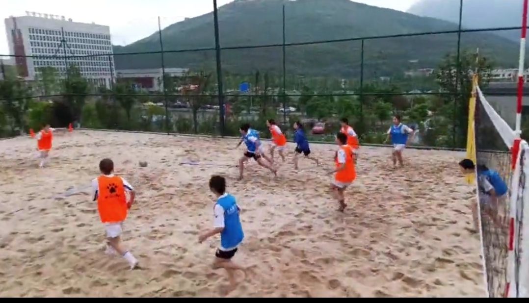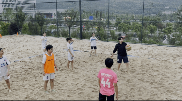 此外,也在沙地上进行比赛。在沙地足球比赛中,两方气场不相上下的队员们在场地上奔跑着,队友彼此配合争夺球权,打进球门赢得胜利。随后的气硬排球比赛,由于分歧,将队员们分为气排组和硬排组,双方势气磅礴,风波不止,有了气霸和硬霸称号。