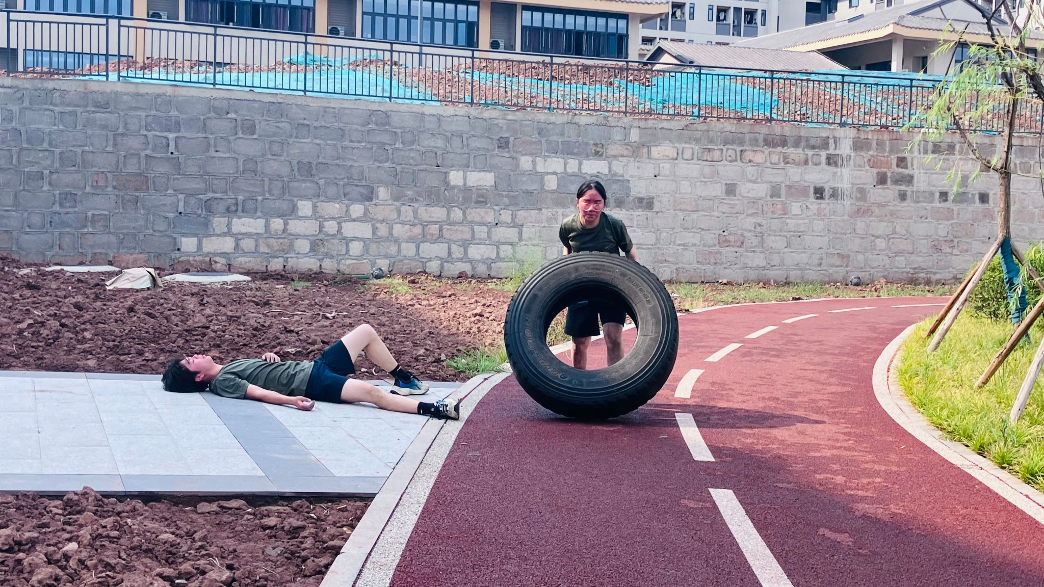随着三声短促有力的哨声,25名队员们顶着困倦,拖着略显沉重的步伐迅速集合。队列训练、会操展示、障碍翻越……38度的高温、200斤的轮胎、1000米的距离,每一个项目都是对队伍艰难的考验。肌肉紧绷、汗如雨下、头晕目眩、腰酸背痛的煎熬接踵而至,猛虎队队长因多次返回接应队员直接抽筋倒地,最后队员们蜂拥而至,一同克服身体的极限到达终点。他们咬紧牙关,用汗水浇灌意志之花,锻造出坚韧的“兵”味,彰显不屈不挠的团队文化。