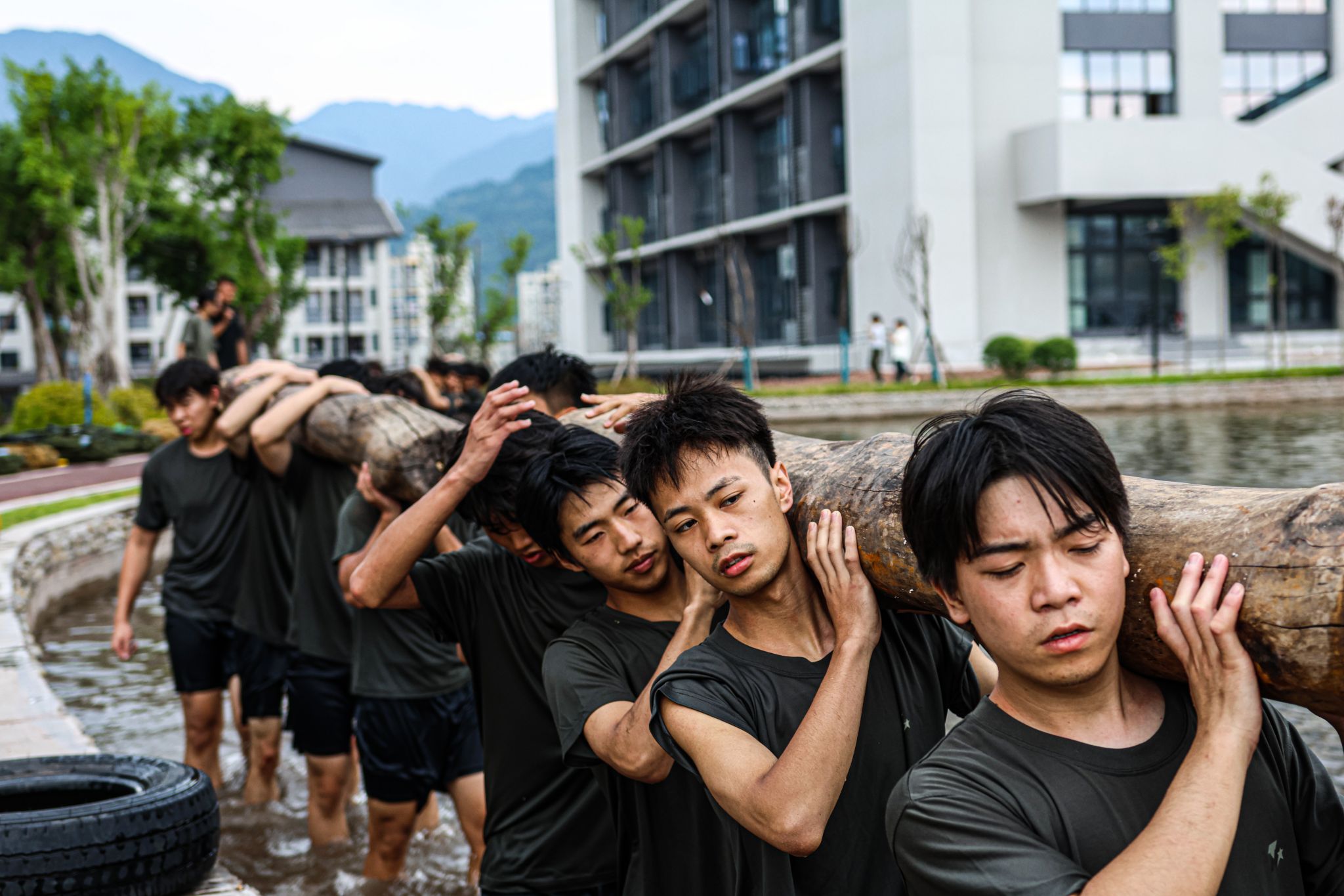 面对沉甸甸的原木和坚硬的轮胎,队员在湖水中艰难前行,每一次呼吸都伴随着湖水冰冷的刺激。手举轮胎,200个深蹲,肌肉在痛苦中呐喊,但眼神中却没有一丝畏惧与低落。接着,100个水下俯卧撑,队员们的心脏在压迫中跳动,但信念却愈发坚定。