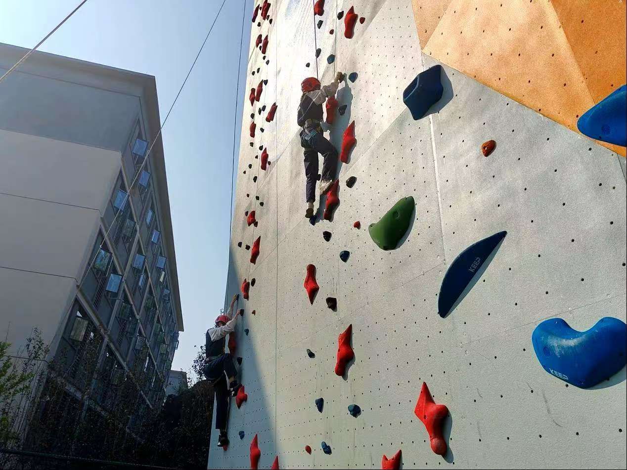 在攀岩场地,教练为同学们讲解攀岩的基础知识,包括场地动的介绍、装备的穿戴、正确的攀爬姿势和发力等。最后,强调的安全问题,避免出现擦伤、撞伤等情况,大家迫不及待地想要体验这项运动。场地内部有两条路线,一条速度道,一条难度道,同学们根据自身情况选择合适自己的线路进行攀爬。当一位挑战同学成功触摸到顶部岩点时,全场爆发出热烈的掌声,现场的氛围被烘托到最高点,激发起后面挑战的同学们斗志。