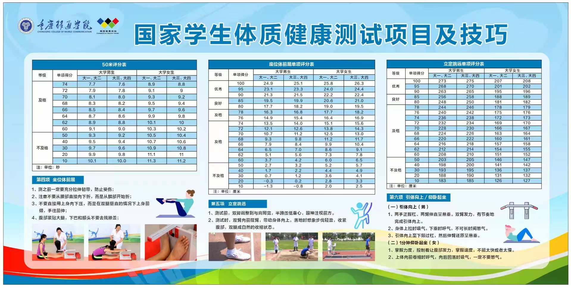 身高、体重、肺活量、50米、坐位体前屈、立定跳远、