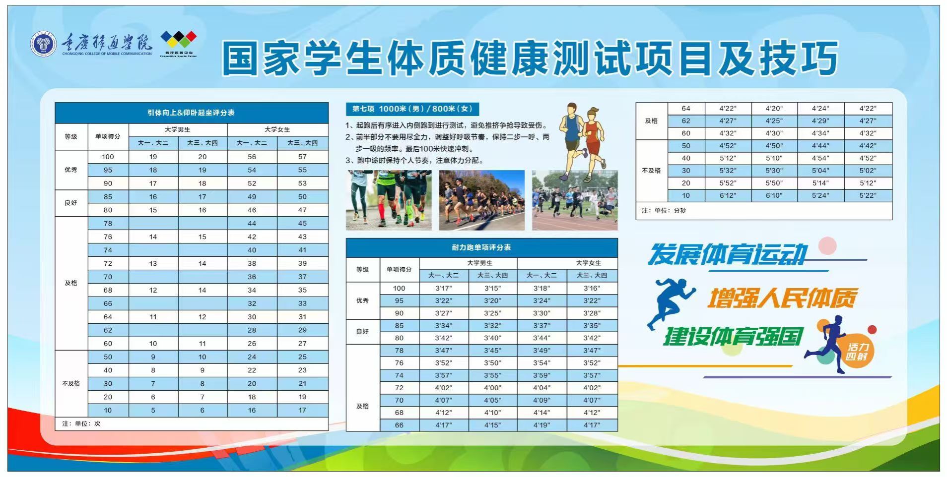 引体向上(男)/仰卧起坐(女)、1000米(男)/800米(女)