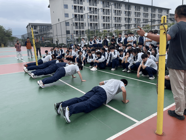 课程第三项:越障。项目开始前所有小队合为一个整体,并且选出五名队长统筹。此挑战要求全部同学在规定时间内跨越绳索,跨越期间方式不限,但是禁止触碰绳索,若违背规则,则所有同学回到起点挑战重新开始,并且五位队长接受俯卧撑惩罚。前几次的挑战,由于经验不足,管控混乱,挑战很快就宣告失败,队长们面对着所有同学接受惩罚。看着队长们涨红的脸,颤抖的双臂,同学们也暗下决心。