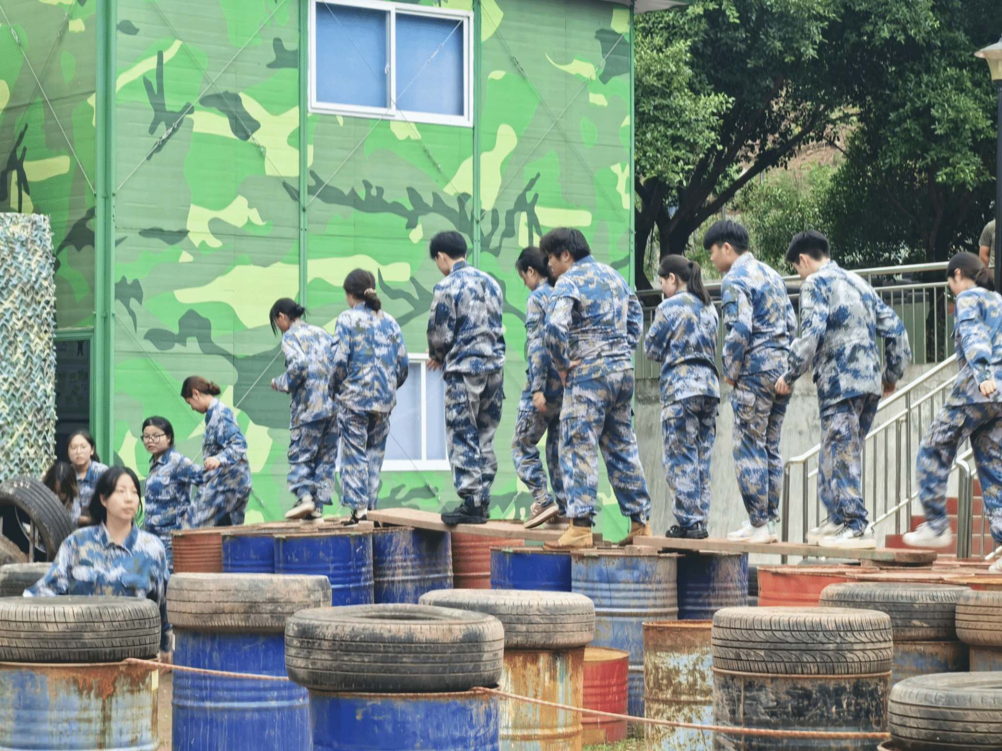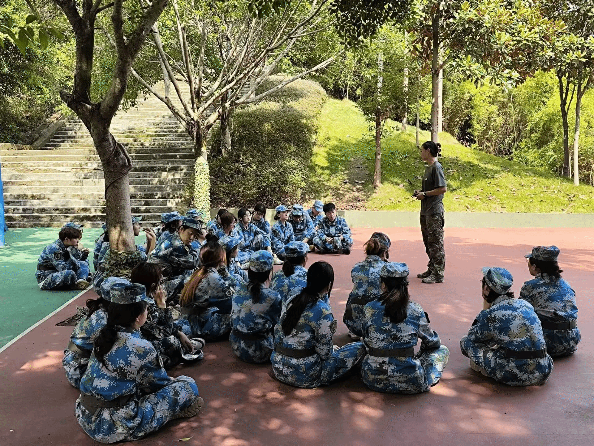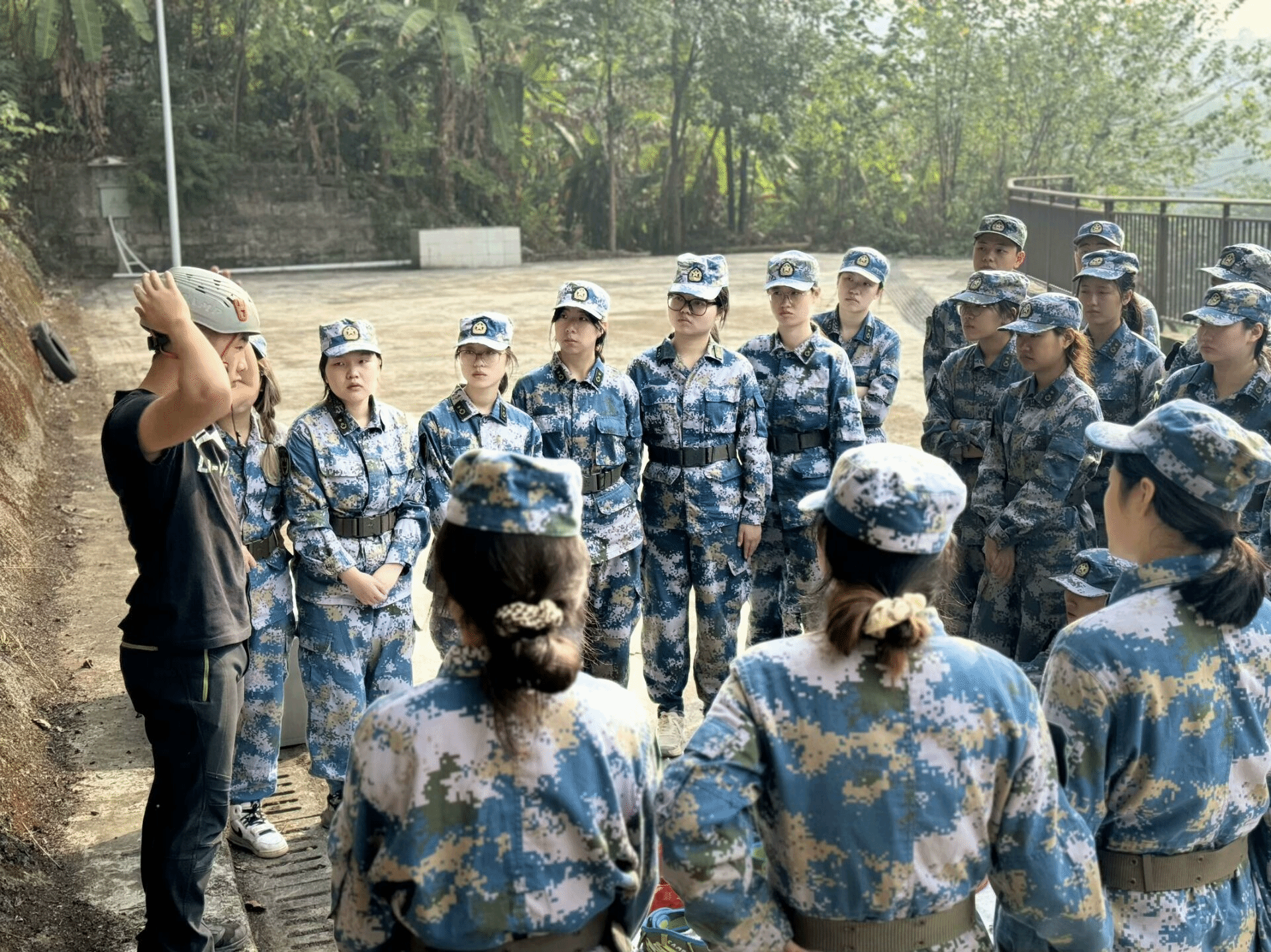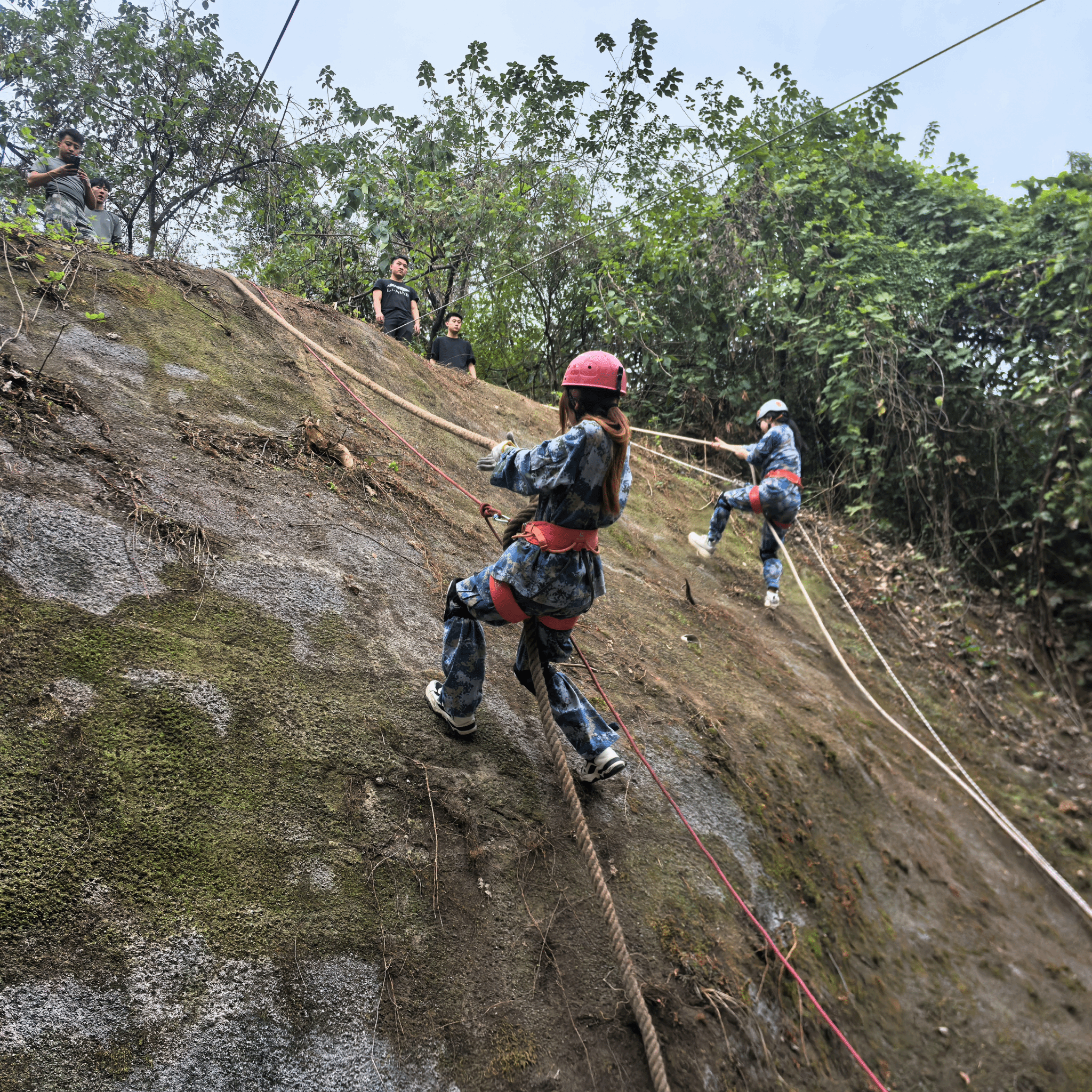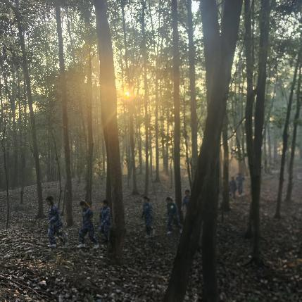 第二天一早,结束了每组轮流站岗的我们跟随着田教练开启了晨练。从训练基地出发,一路晨跑到花果山社区,接着又上下穿越山林。期间有同学上陡坡时有些困难,周围的同学都伸出援手拉一把或者扶着走,没有谁会不适。渐渐我们都融入了4班这个大家庭,团结着走下去。吃完早餐,伴随着好天气的出现我们体验了刺激的丛林速降何攀登。教练和助教们为我们细心讲解了佩戴方式,在目的地保驾护航。最开始的时候都有些担忧,这时班长首当其冲先来打了个样,就这样大家也跃跃欲试了。排好队依次体验不一样的风采。