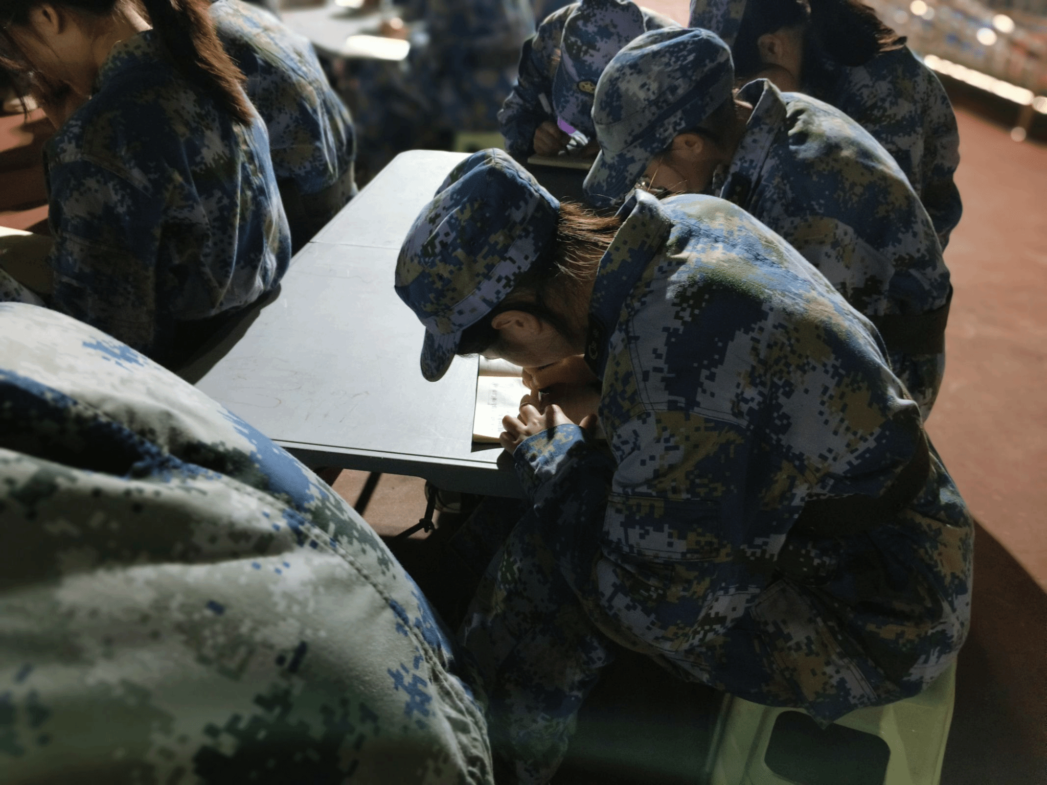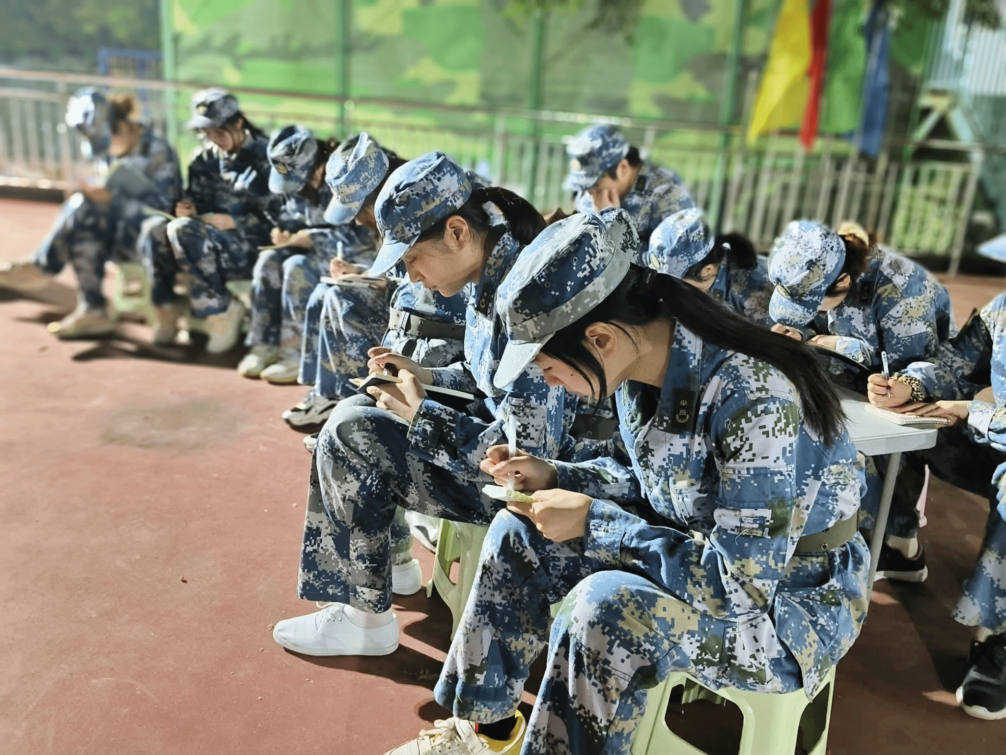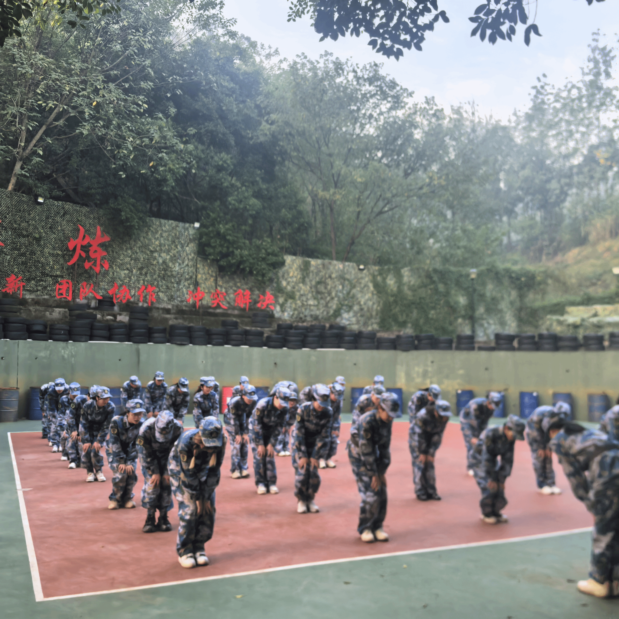 在短暂的休息后,余教练告诉我们根据班上人数分为四个队伍为晚上的晚餐规格进行PK,这无疑激发了大家奋斗的意志。差不多二十分钟后,每个队伍都尽力展现为着晚餐而努力,齐声呐喊口号搭配设计好的动作,有效的进行协作。最后在知晓结果后没有获得最好食材的队伍并没有沮丧,快速分配好做晚餐的人员,分工明确。在淬炼的三顿餐中,我们都要先背诵餐前训,坚定有力的声音回荡着,践行好光盘行动。